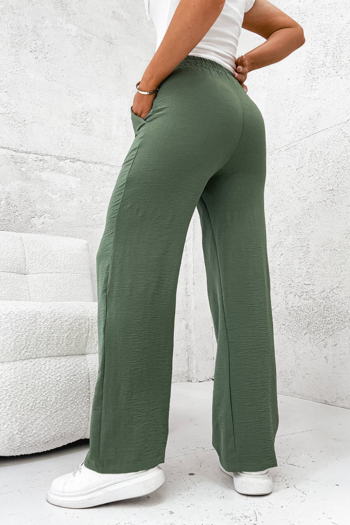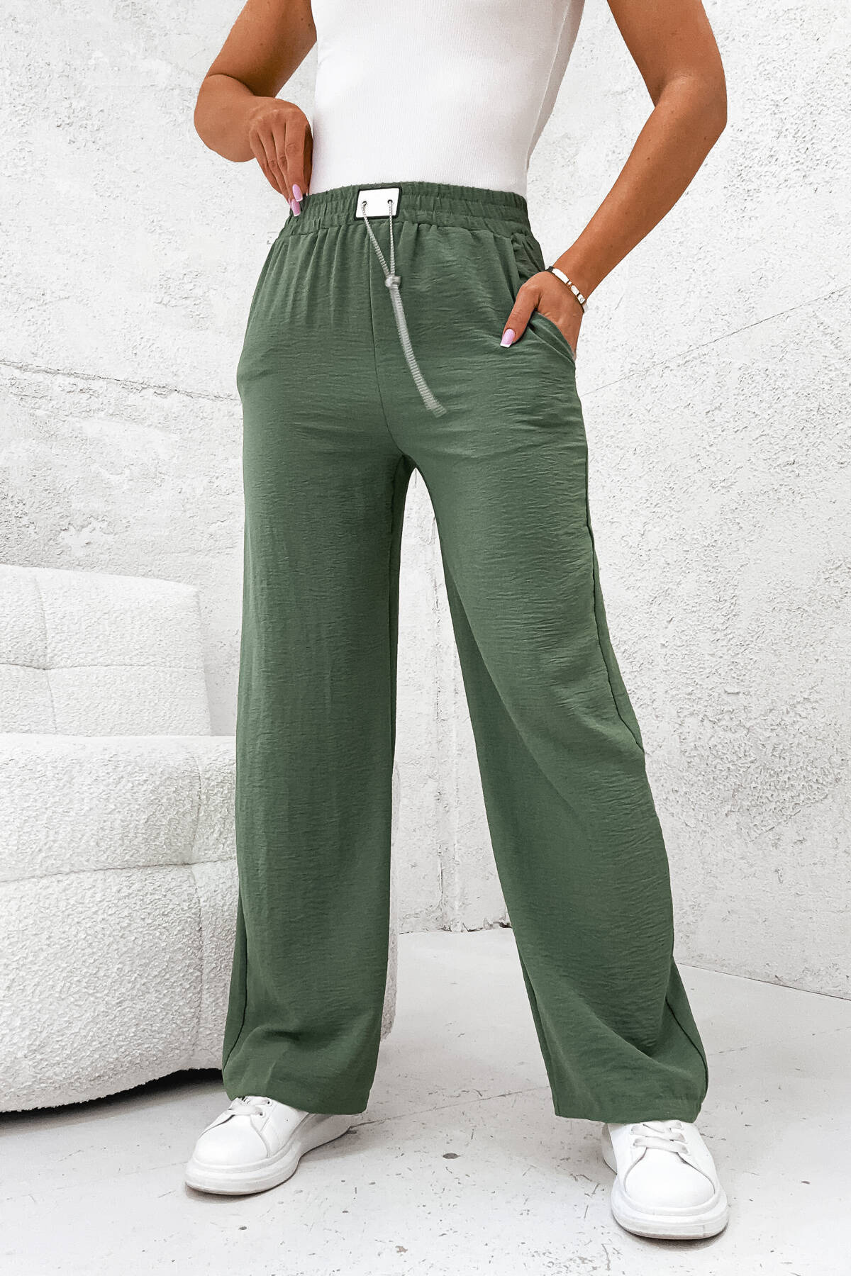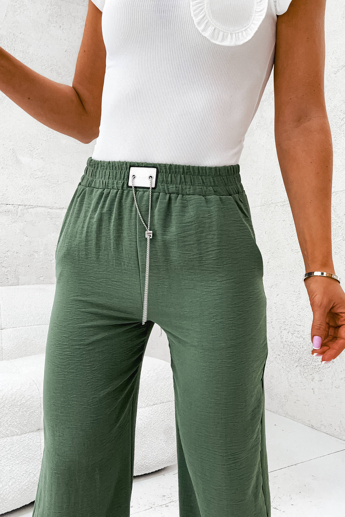 SPODNIE MATERIAŁOWE Z SZEROKĄ NOGAWKĄ I ŁAŃCUSZKIEM W PASIE- ZIELONE