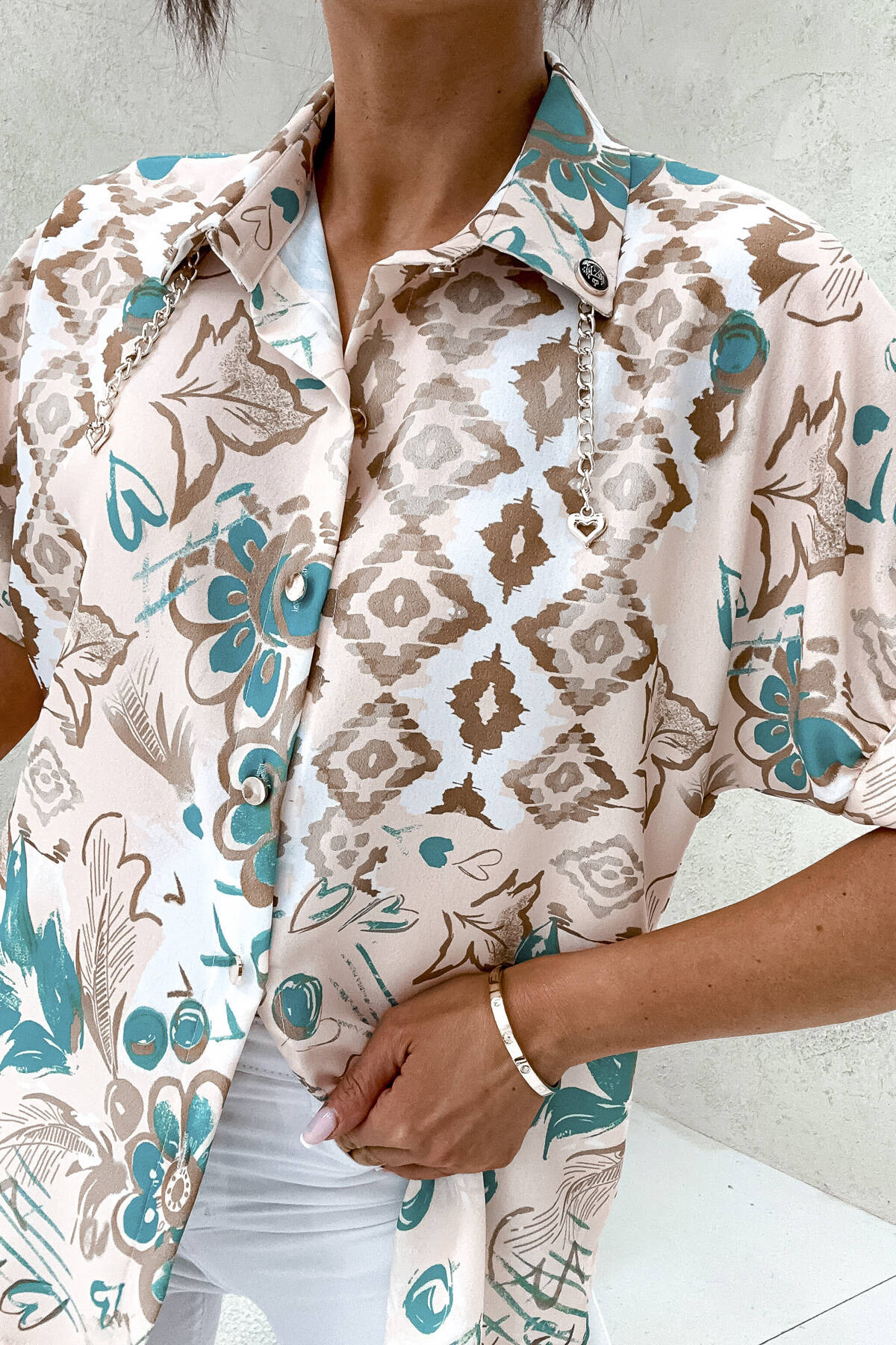 WZORZYSTA BLUZKA ZAPINANA NA GUZIKI Z ŁAŃCUSZKAMI-BEŻOWA