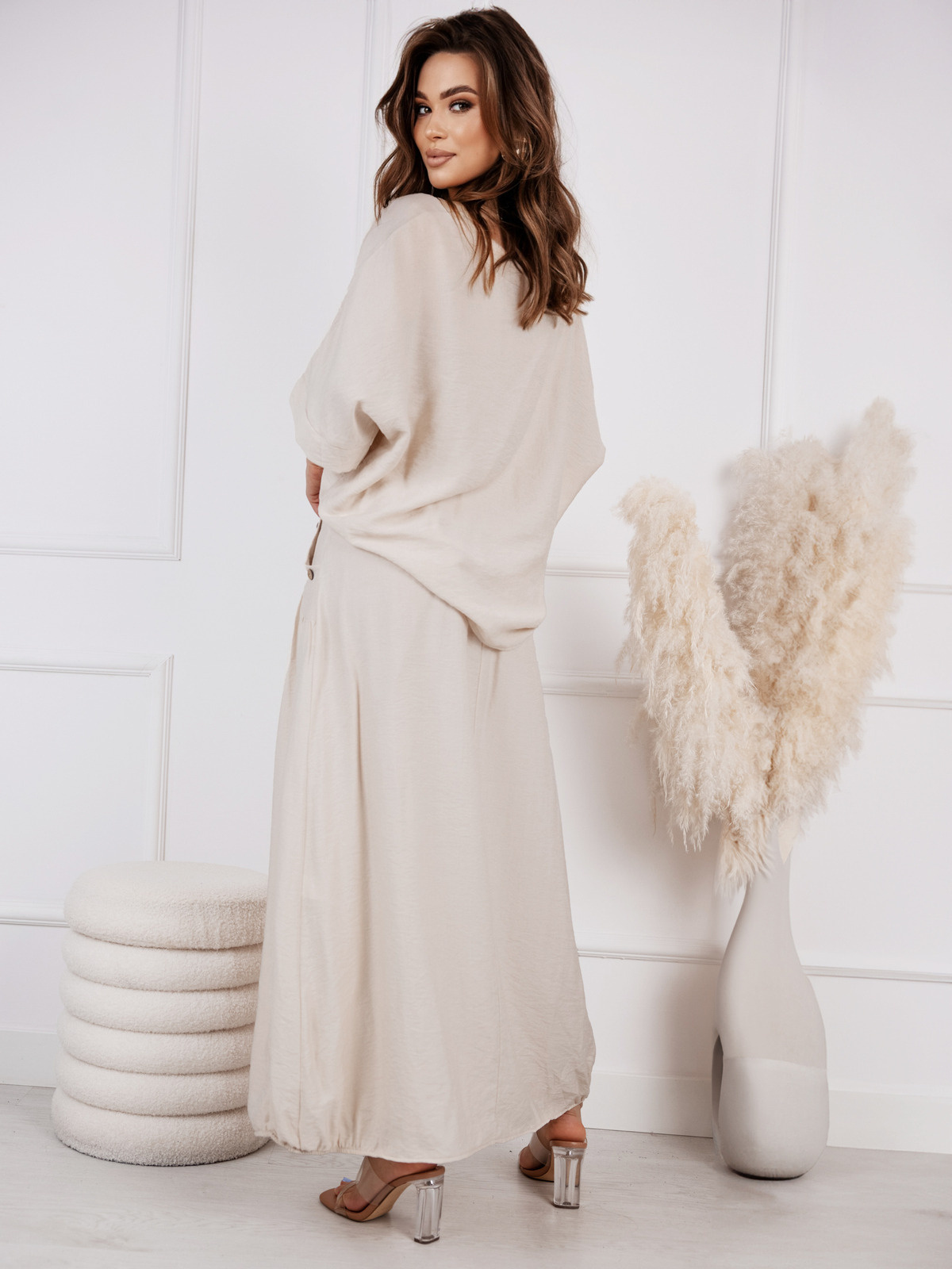 DZIANINOWY KOMPLET BLUZKA Z KWATEM+SPÓDNICA MAXI- BEŻOWY