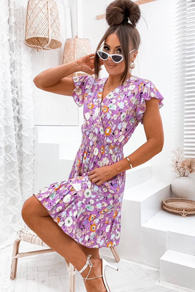SUKIENKA MINI W KWIATY DEKOLT KOPERTOWY I GUMKA W PASIE- FIOLETOWA