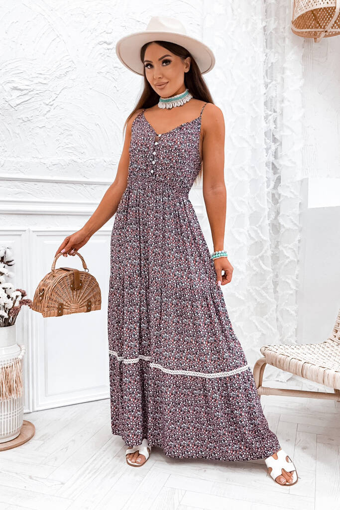 SUKIENKA MAXI W KWIATY NA RAMIACZKA Z FALBANKĄ- CZARNA