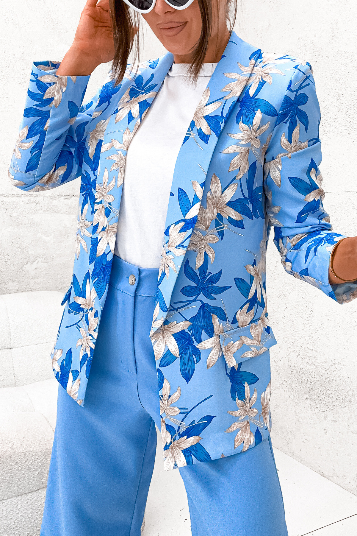 KOMPLET MARYNARKA W KWIATY + SZEROKIE SPODNIE- NIEBIESKI