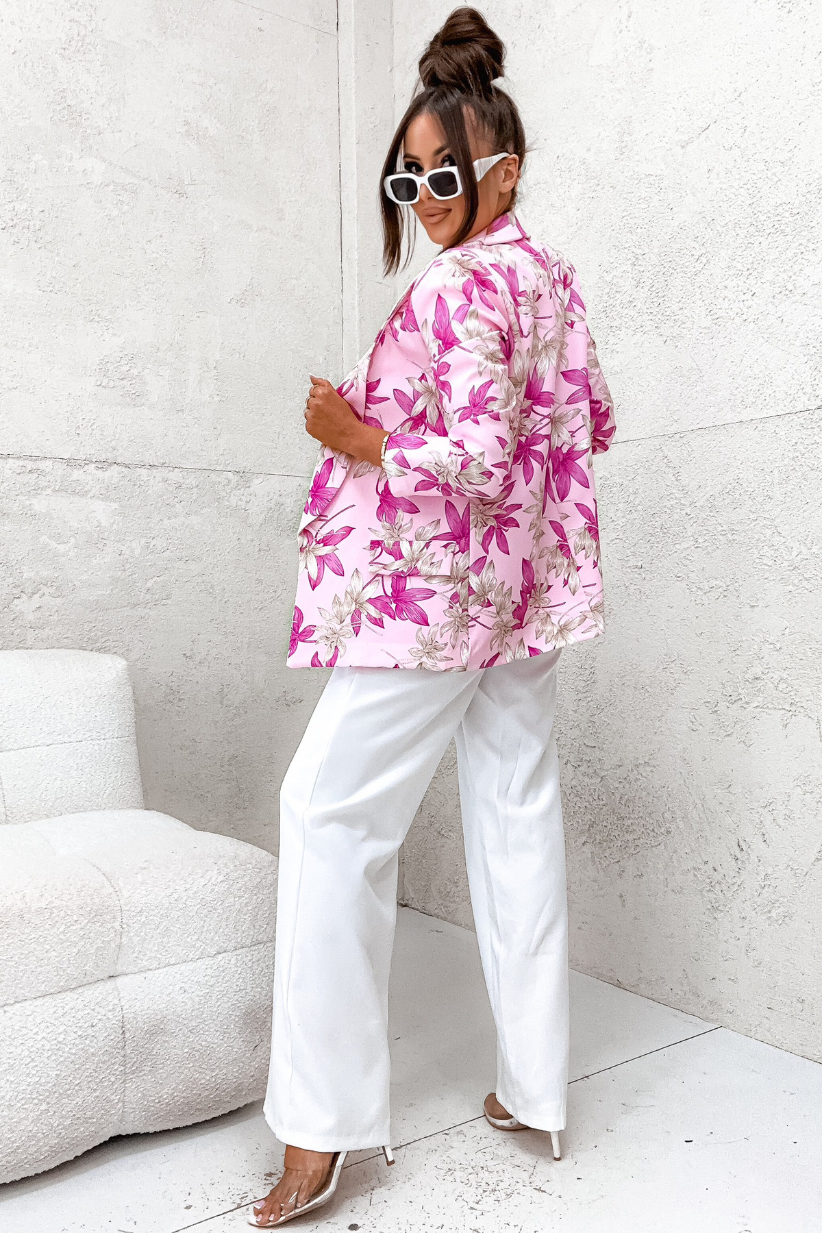 KOMPLET MARYNARKA W KWIATY + SZEROKIE SPODNIE- RÓŻOWY