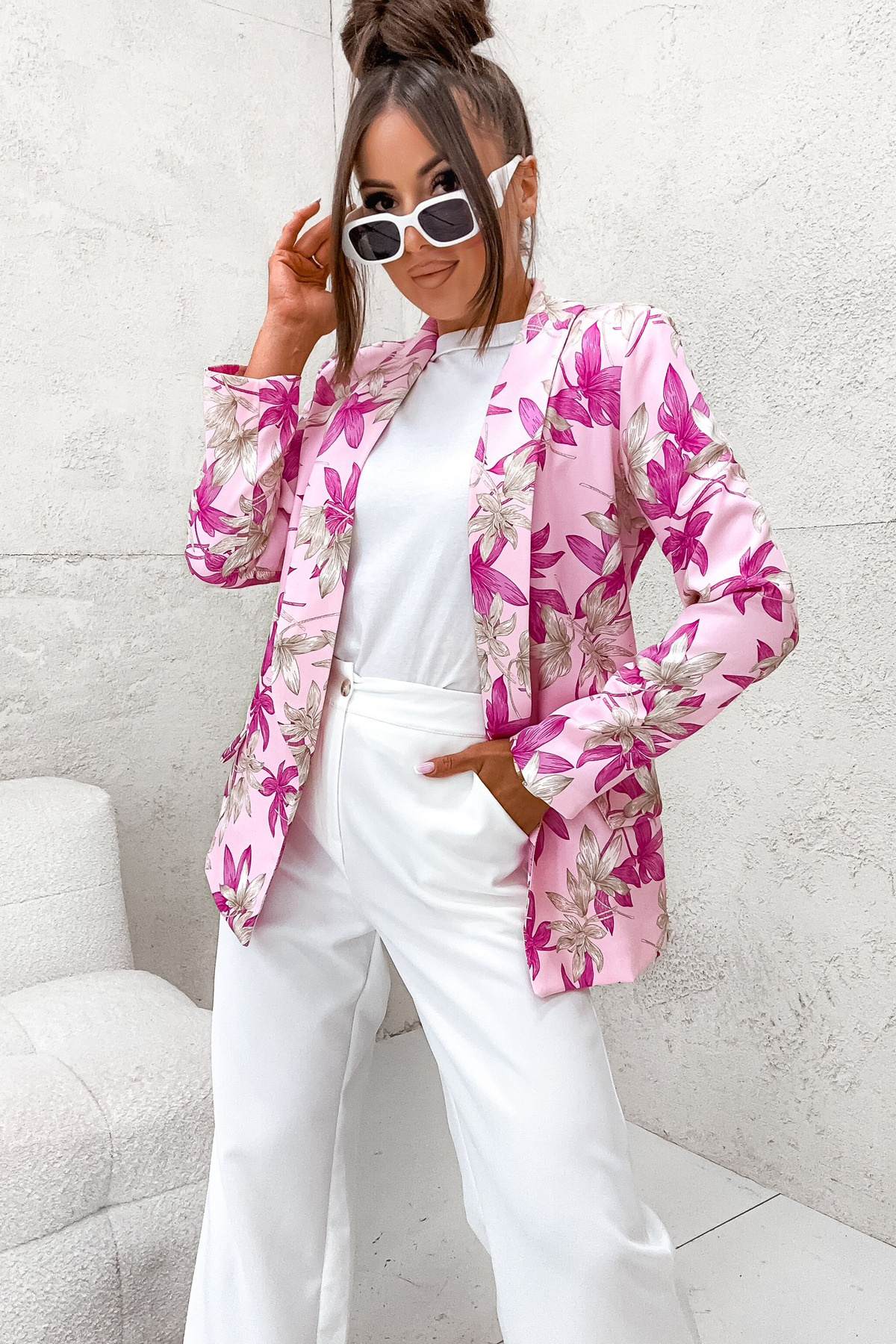 KOMPLET MARYNARKA W KWIATY + SZEROKIE SPODNIE- RÓŻOWY