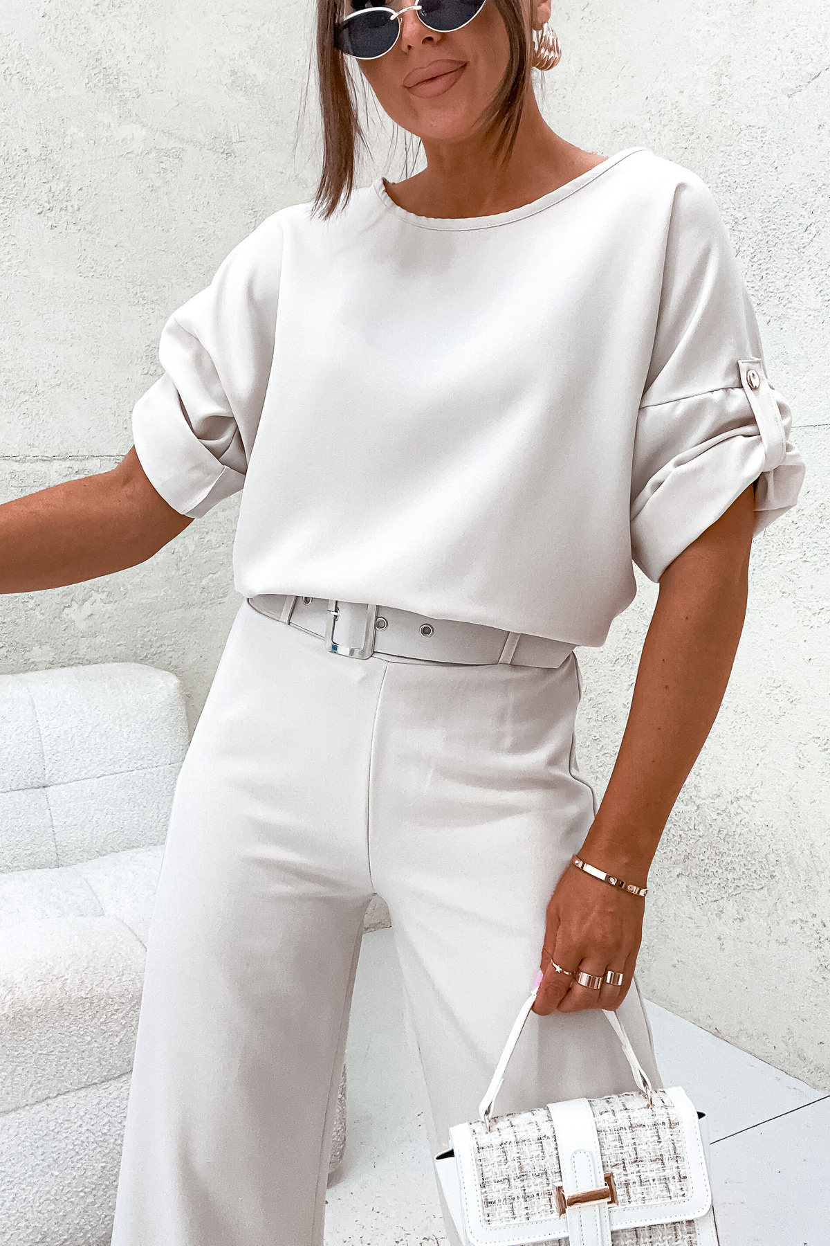 JASNO BEŻOWY KOMPLET SZEROKIE SPODNIE+ BLUZKA Z GUZIKAMI NA RĘKAWACH