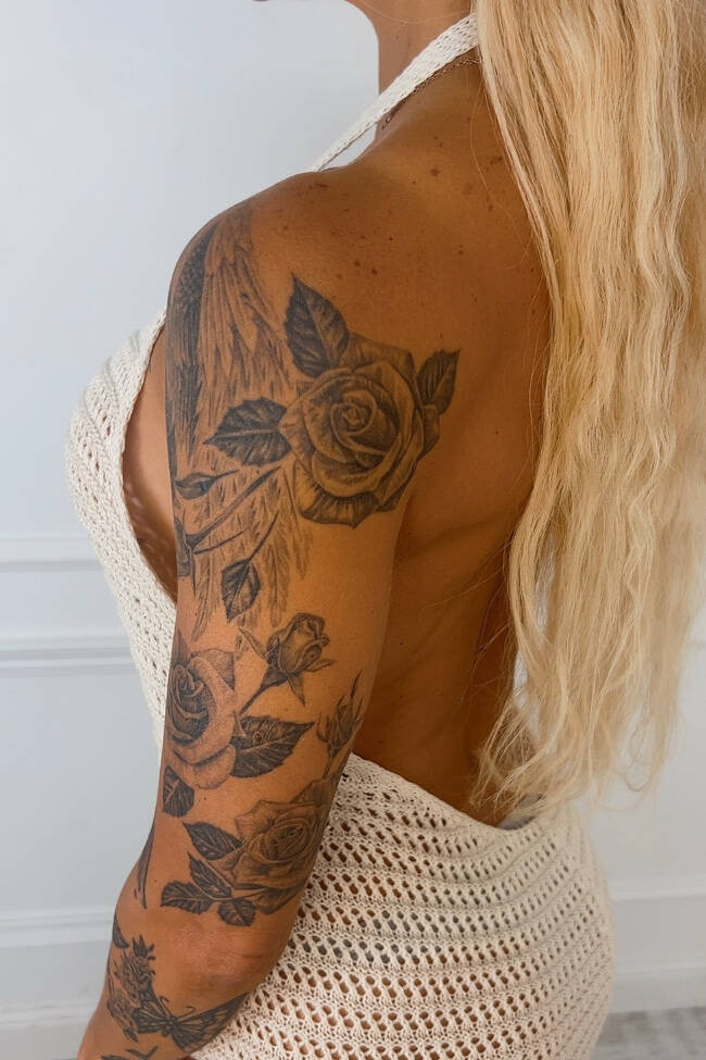 SUKIENKA WIĄZANA NA SZYI Z OZDOBNYM KWIATEM- BEŻOWA