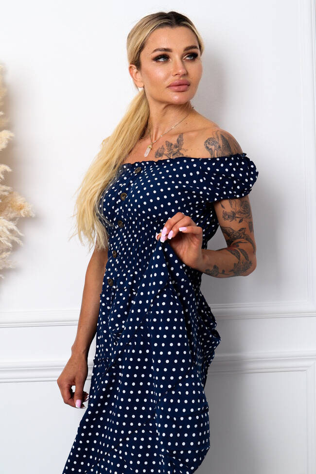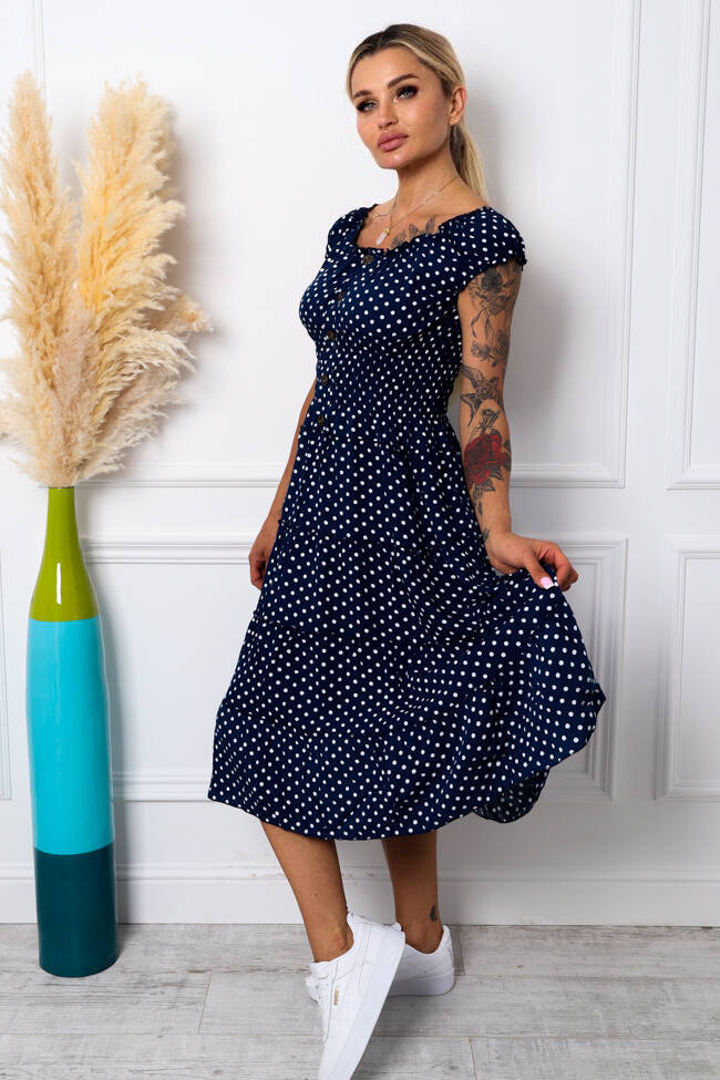 SUKIENKA MIDI W KROPKI Z GUZIKAMI-GRANATOWA