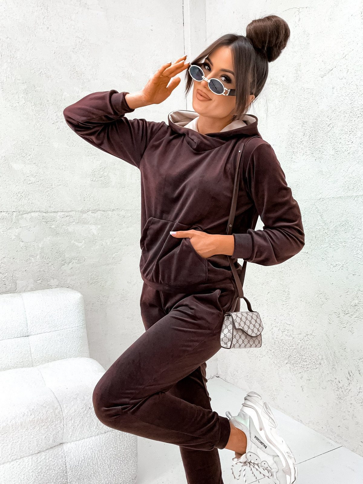WELUROWY KOMPLET DRESOWY BLUZA Z KAPTUREM+ SPODNIE- CZEKOLADOWY