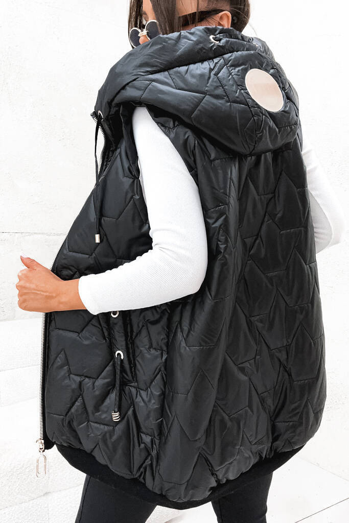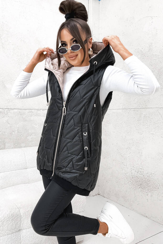 Asymetryczna pikowana kamizelka z kapturem, zapinana na złoty zamek, na dole ściągacz. Naszywka na kapturze, złote elementy przy kieszeniach.