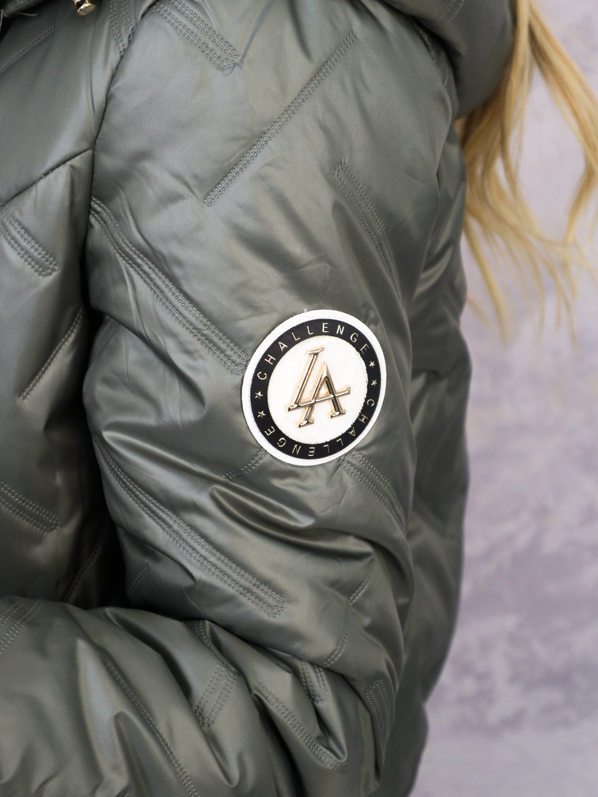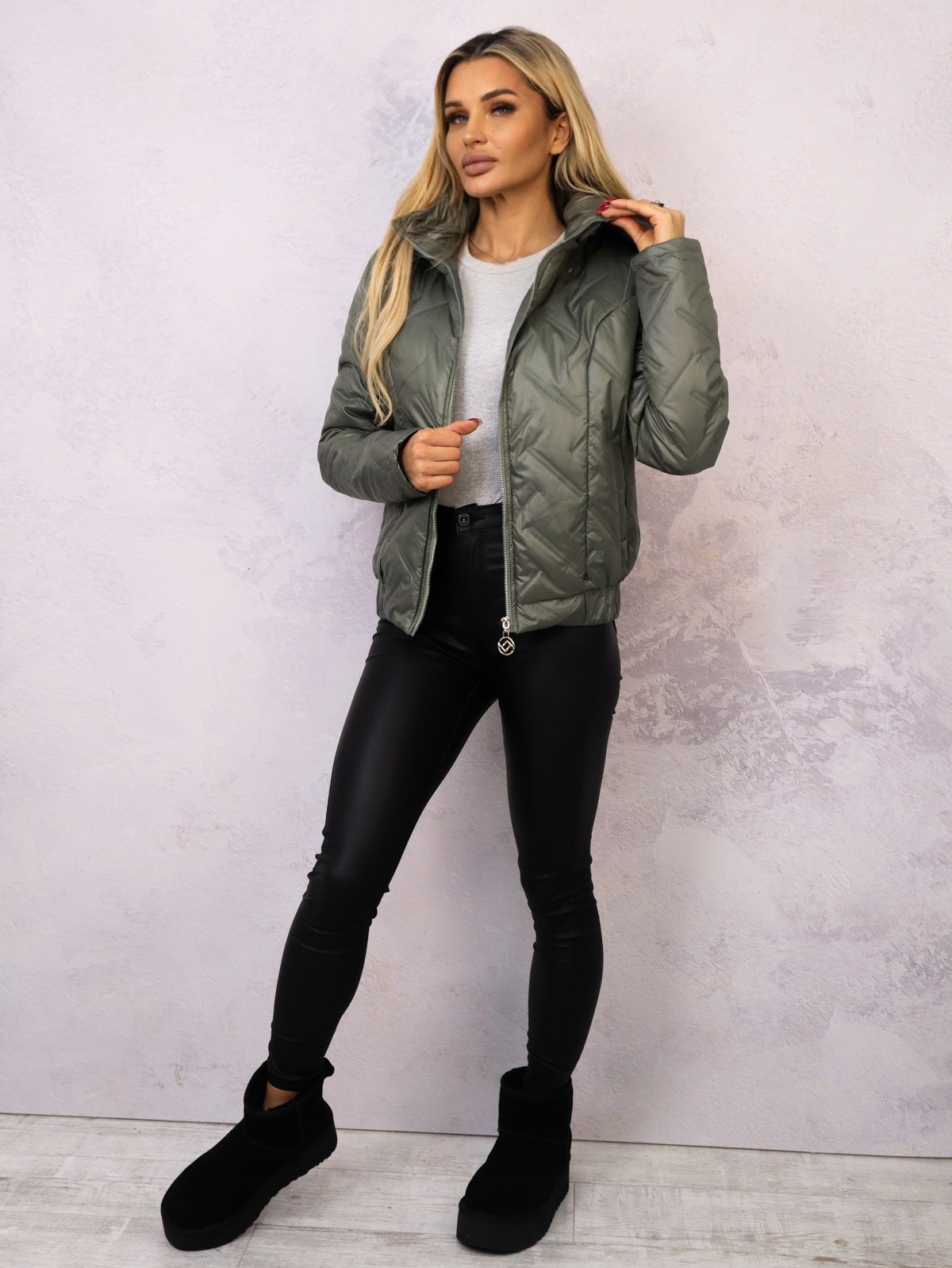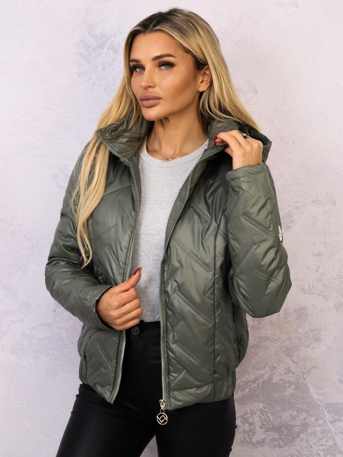 Kurtka przejściowa, wykonana z pikowanej tkaniny, zapewniającej ciepło i styl. Posiada ozdobny złoty zamek oraz praktyczny kaptur, idealny na chłodniejsze dni. Wyposażona w kieszenie, elastyczne mankiety oraz dolny ściągacz.