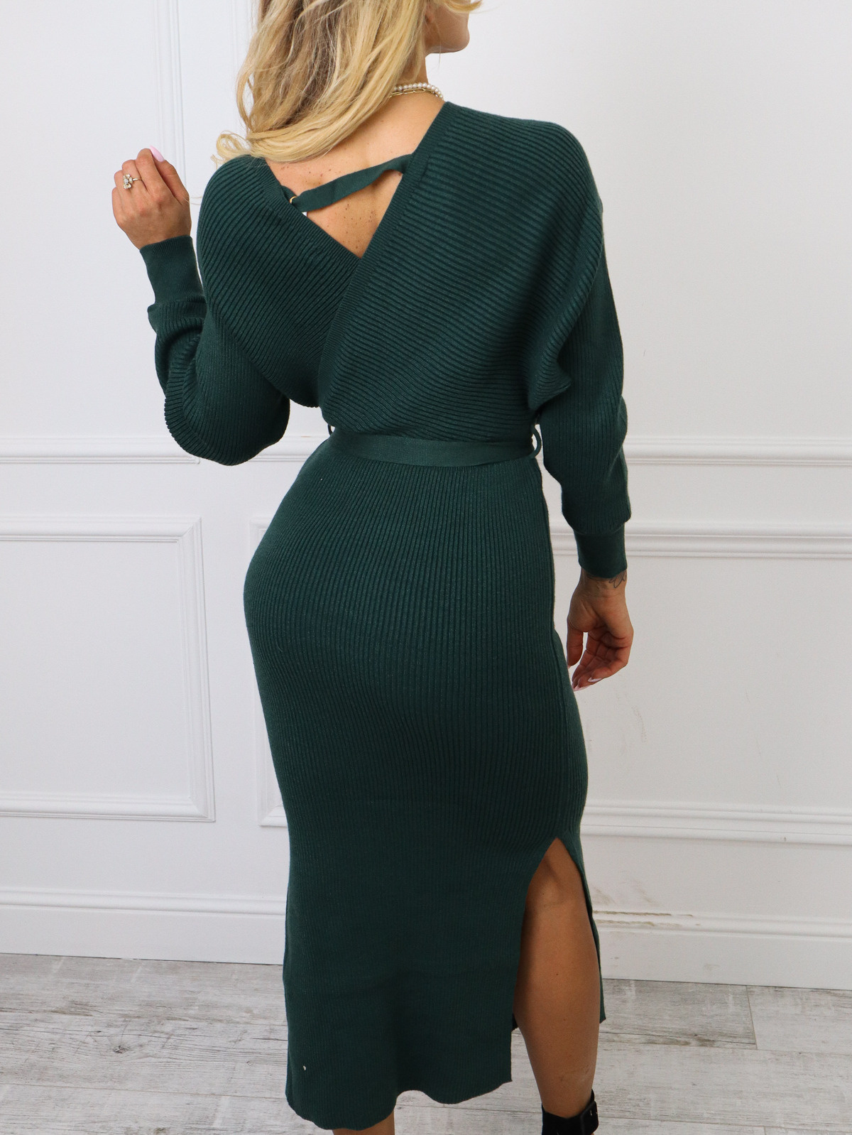 DZIANINOWA SUKIENKA MIDI WIĄZANA W PASIE- ZIELONA