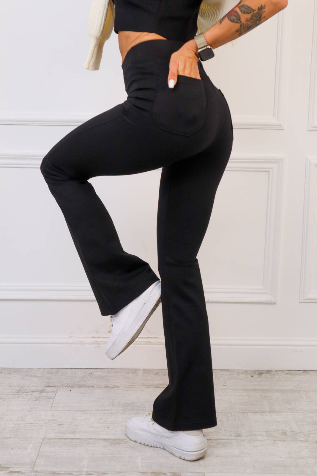 Dżersejowe spodnie. Wysoki stan, kryta elastyczna talia, rozszerzane nogawki.