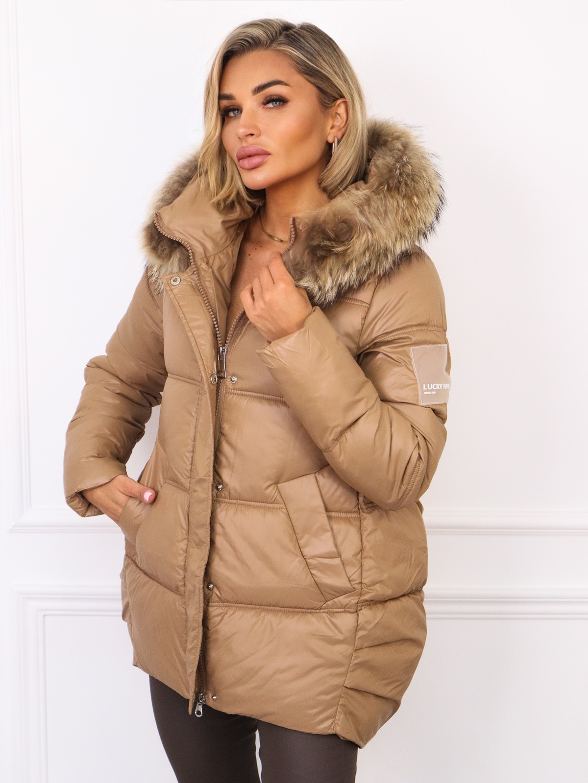 KURTKA ASYMETRYCZNA Z NASZYWKĄ NA RĘKAWIE I FUTERKIEM- BRĄZOWA