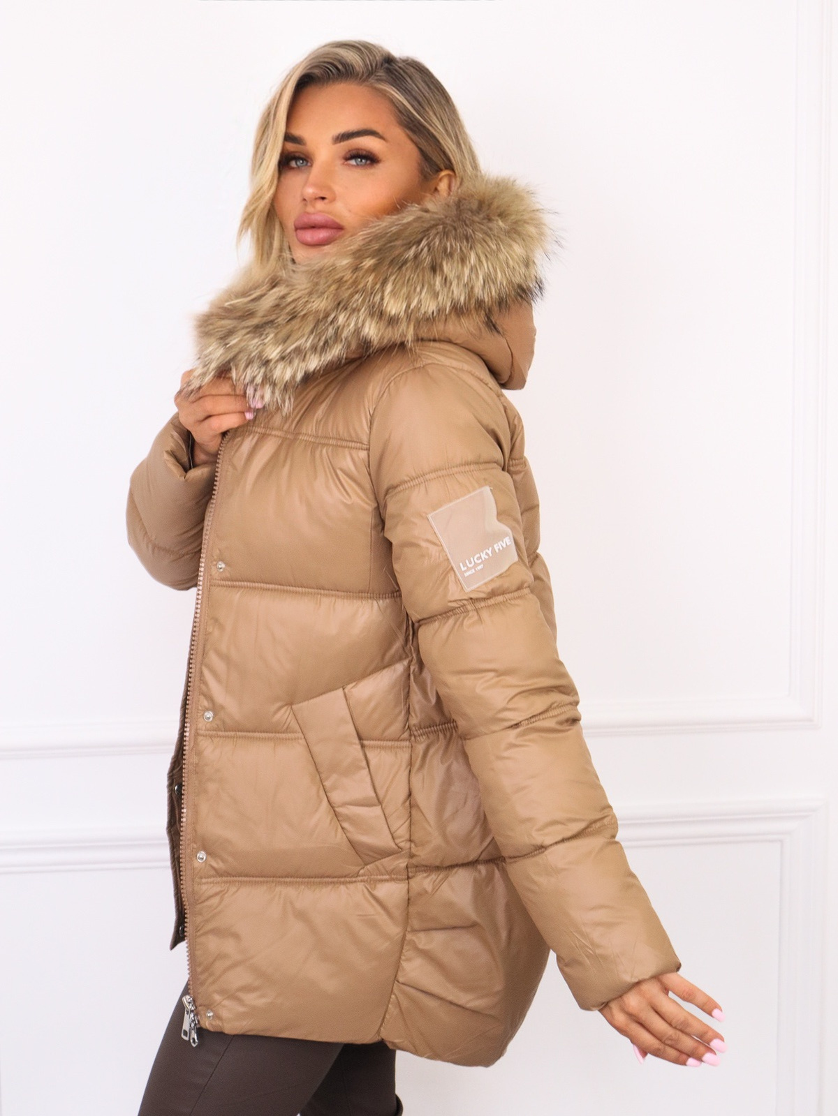 KURTKA ASYMETRYCZNA Z NASZYWKĄ NA RĘKAWIE I FUTERKIEM- BRĄZOWA