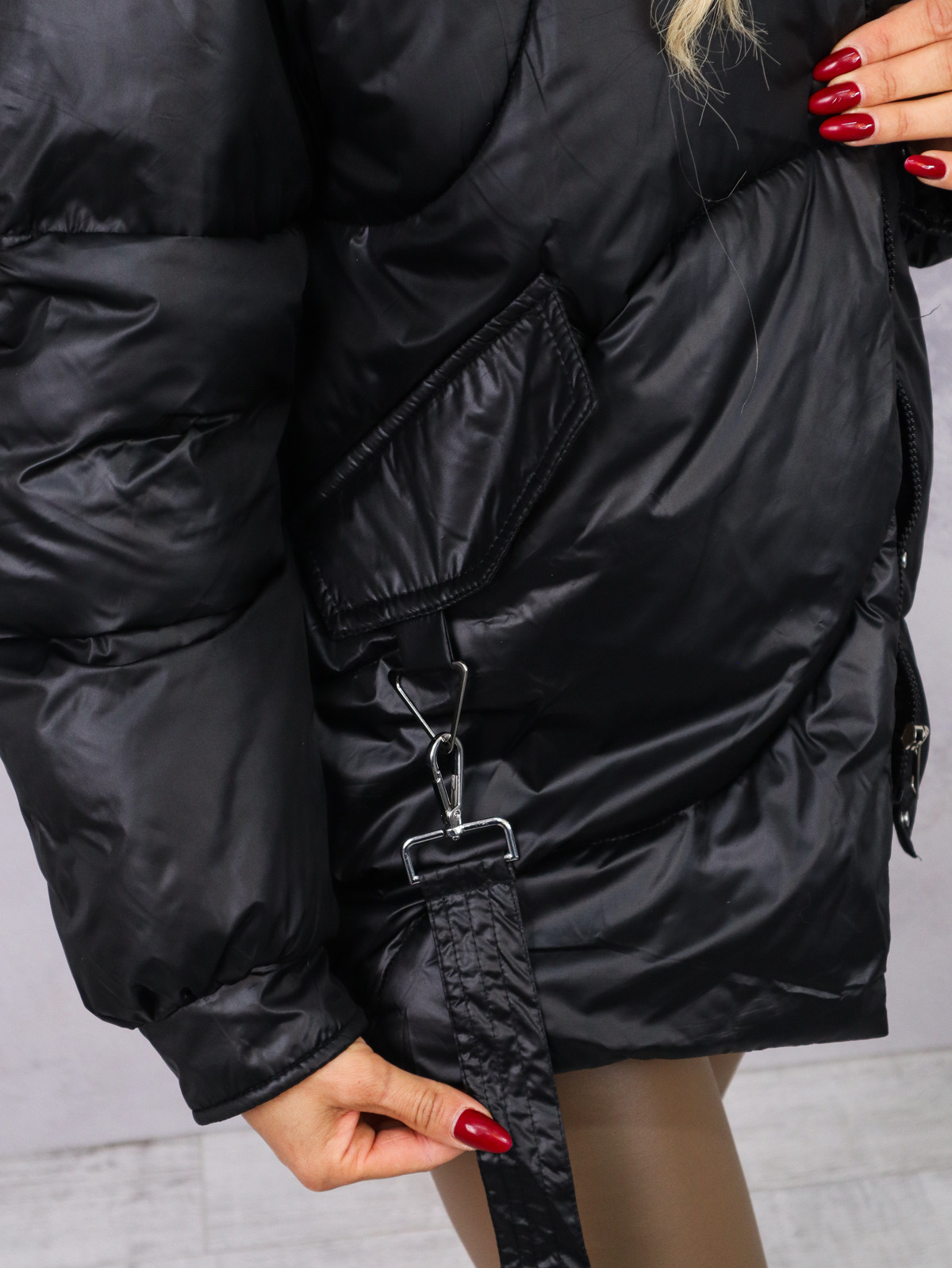 KURTKA ASYMETRYCZKA Z ZAWIESZKA PRZY KIESZENI I TROCZKAMI- CZARNA
