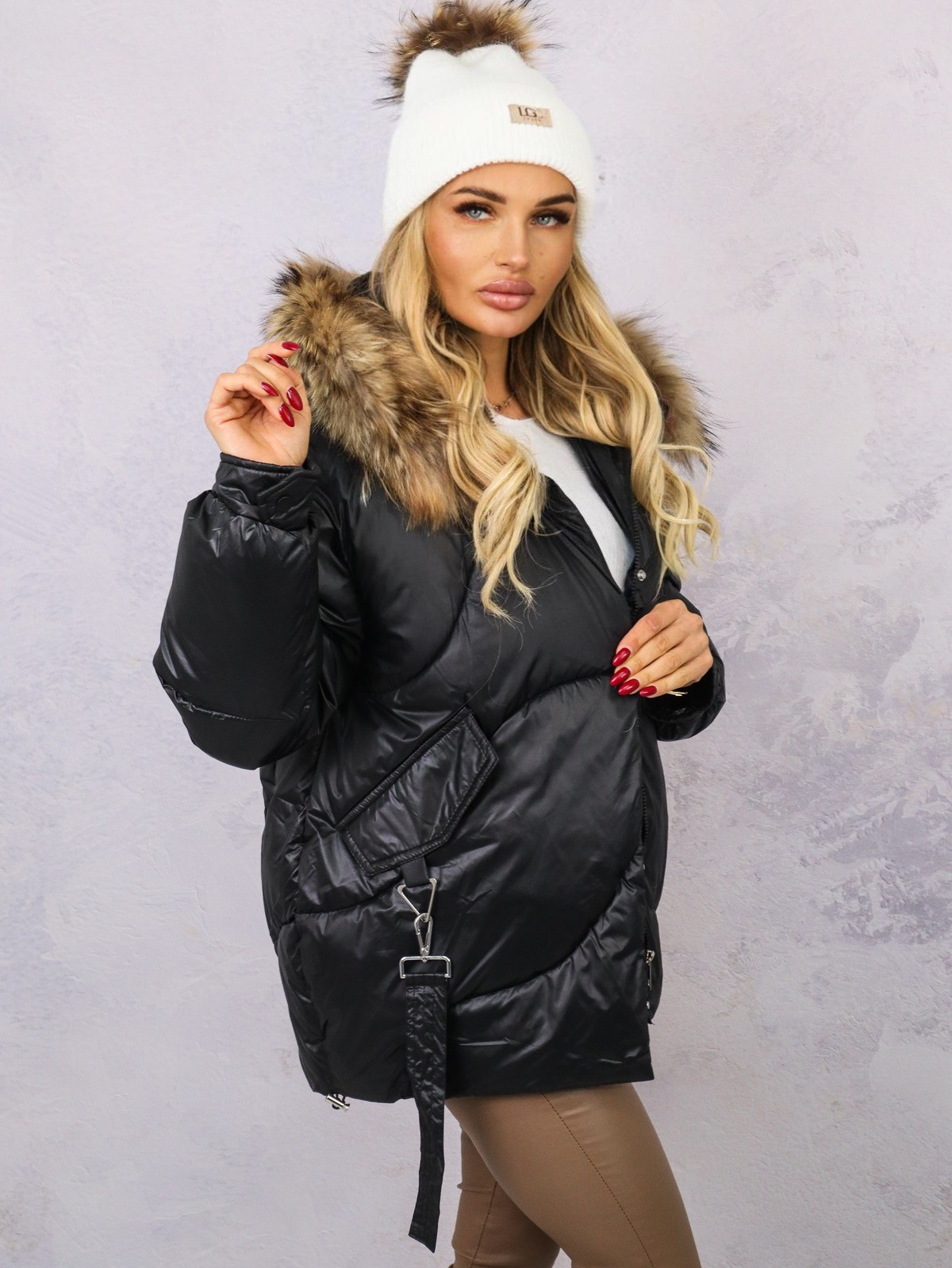 Kurtka z dużym kapturem nieodpinanym , obszytym szerokim sztucznym futerkiem które można odpiąć od kaptura. Zapinana na zamek i zapinana dodatkowo napami, posiada dwie kieszenie po bokach kurtki z ozdobną zawieszką.