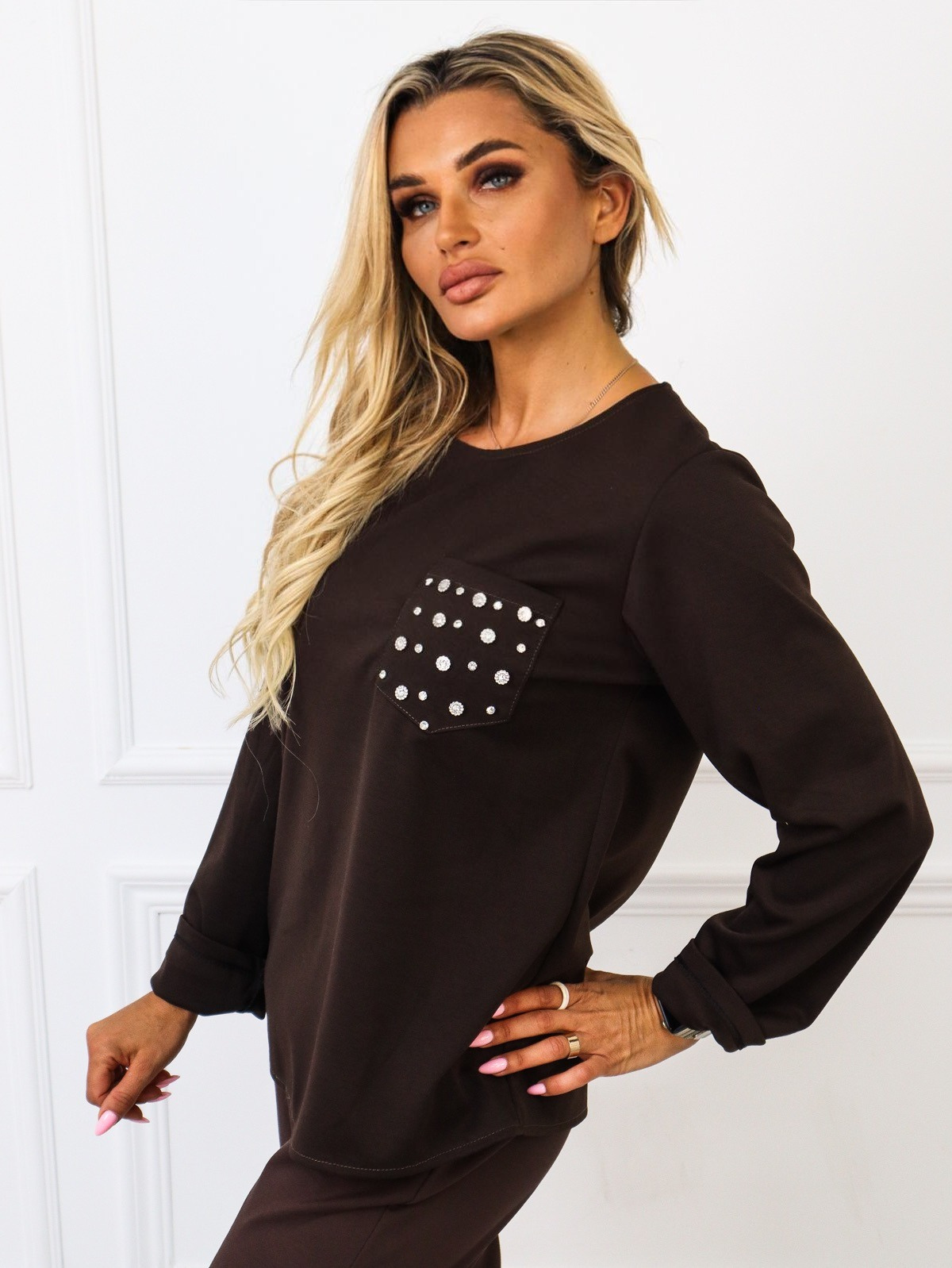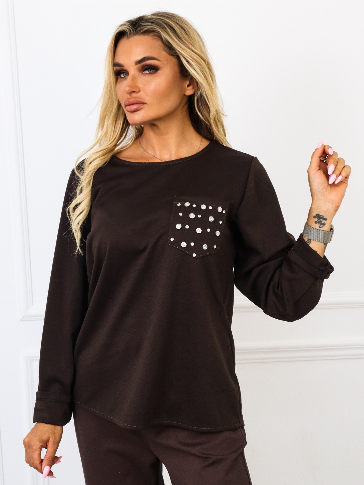BAWEŁNIANA BLUZKA Z KIESZENIĄ  W OZDOBNE KWIATY CYRKONIE- BRĄZOWA