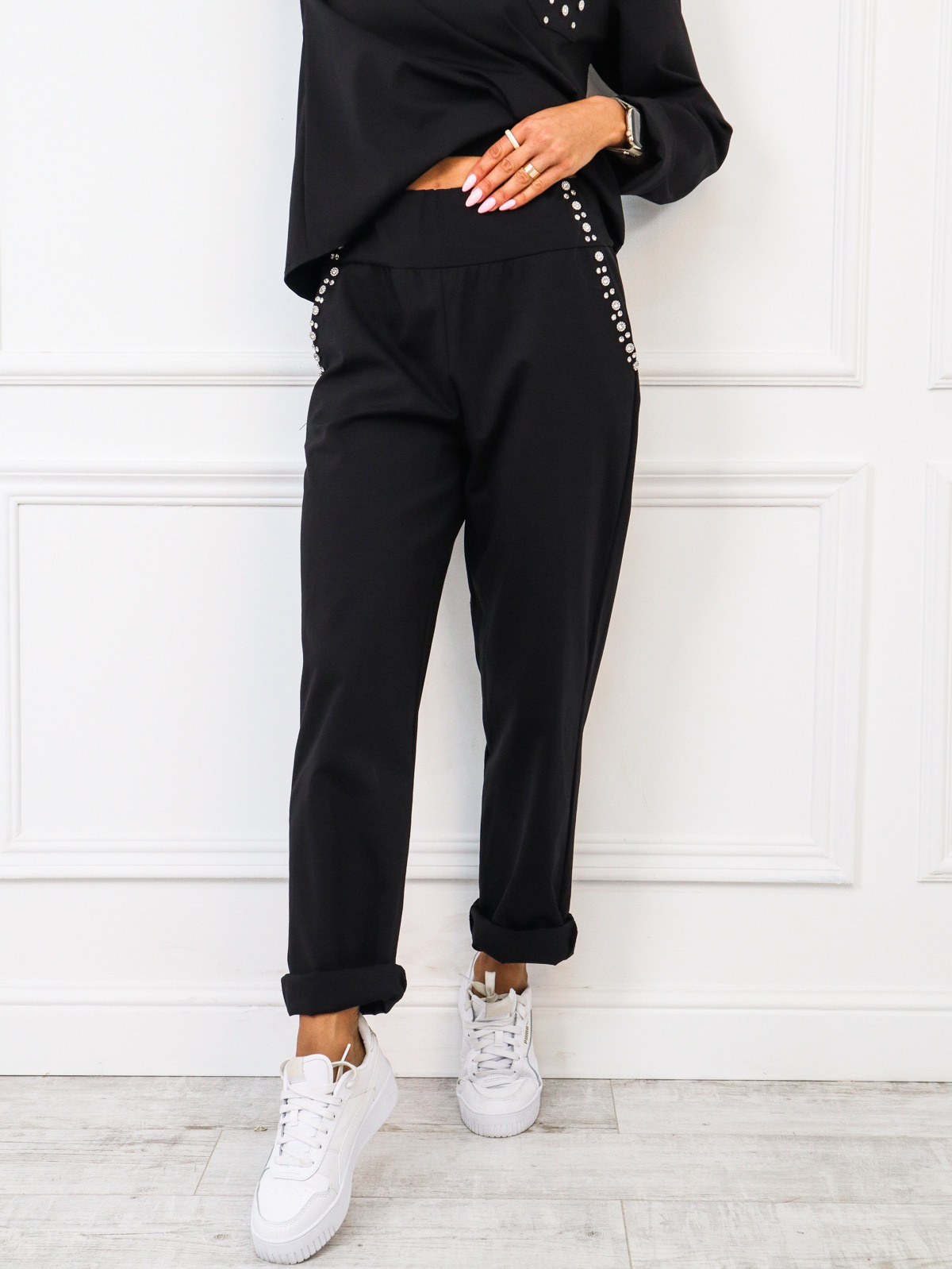 MATERIAŁOWE SPODNIE Z OZDOBNYMI CEKINAMI PRZY KIESZENIACH- CZARNE