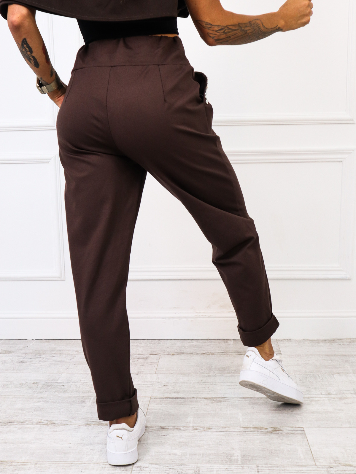 MATERIAŁOWE SPODNIE Z OZDOBNYMI CEKINAMI PRZY KIESZENIACH- CIEMNY BRĄZ