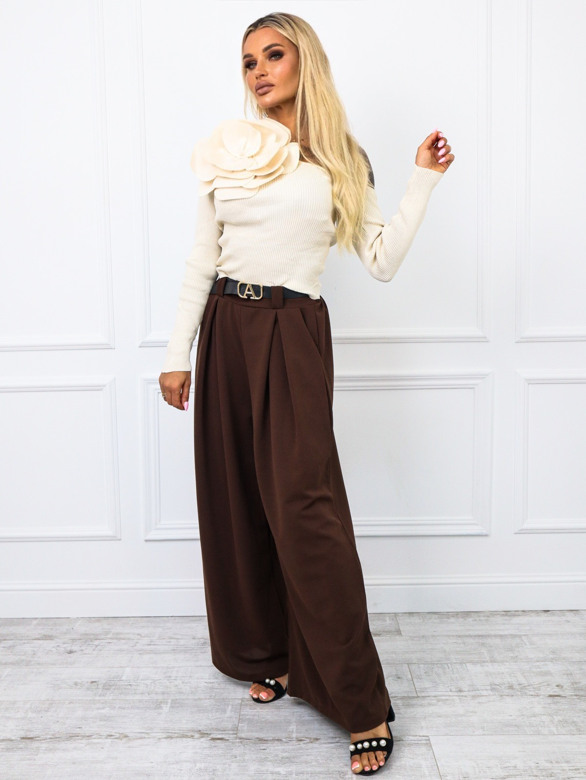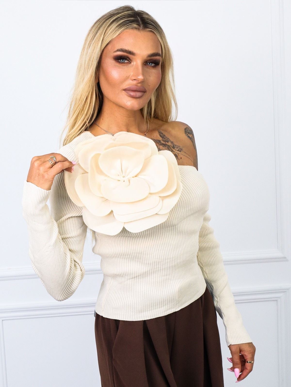 BLUZKA PRĄŻKOWANA NA JEDNO RAMIE Z DUŻYM KWIATEM- BEŻOWA
