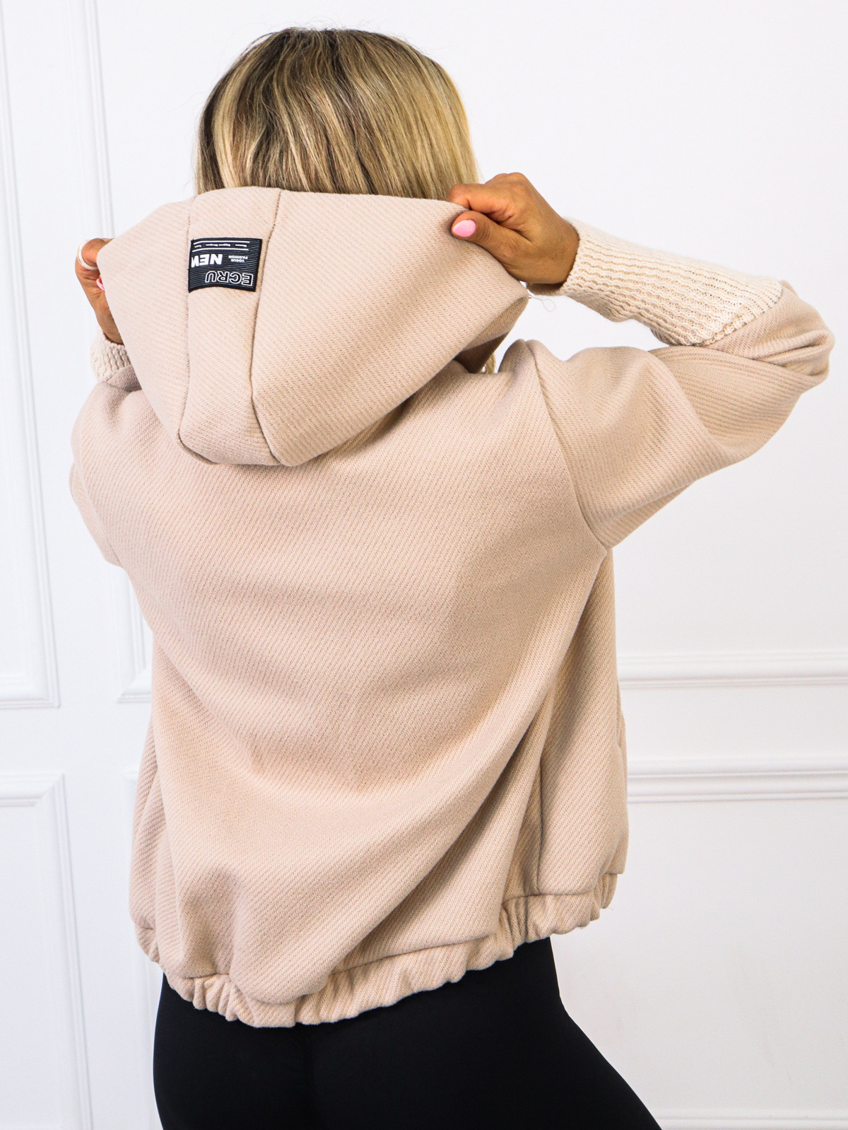 KURTKA Z KAPTUREM I DŁUGIM ŚCIAGACZEM NA RĘKAWIE- BEŻOWA