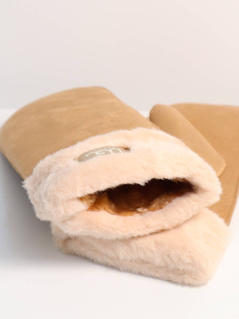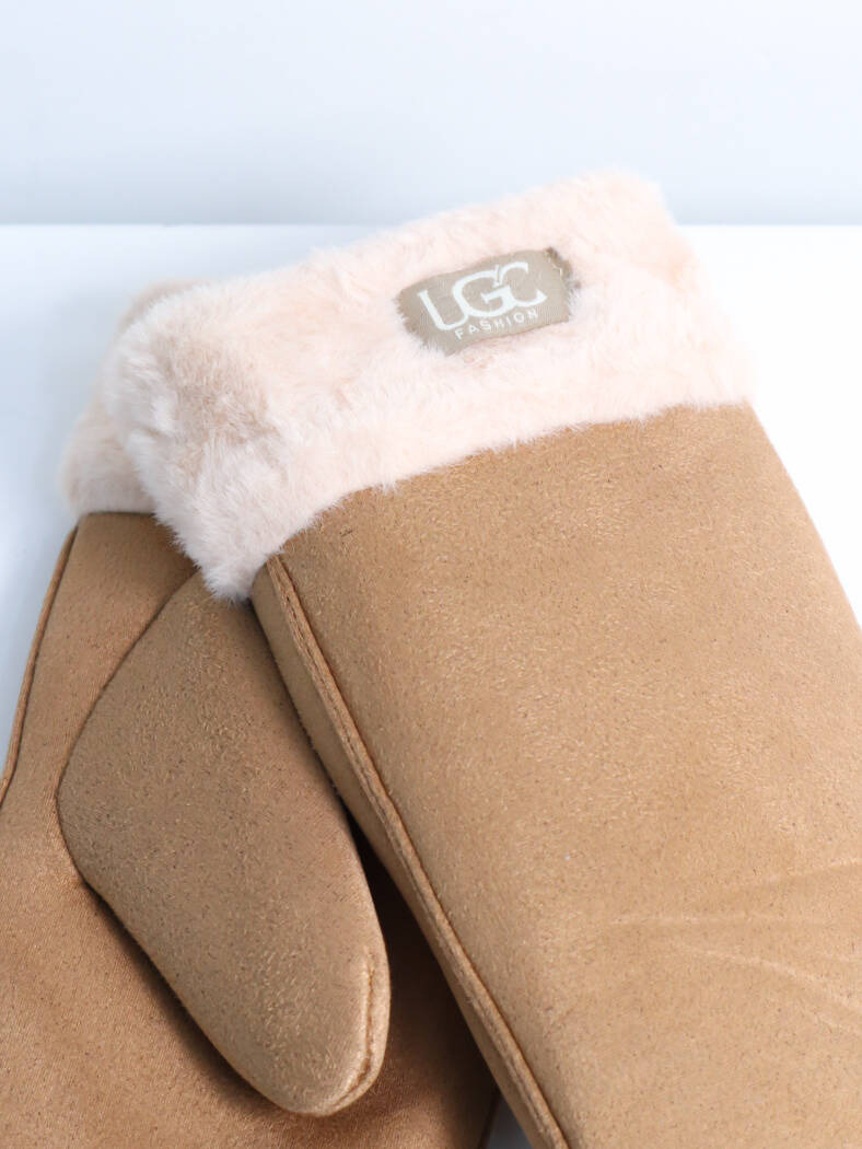 RĘKAWICZKI ZAMSZOWE Z FUTRZANYM ŚCIAGACZEM Z JEDNYM PALCEM Z LOGIEM LGC- BRĄZOWE