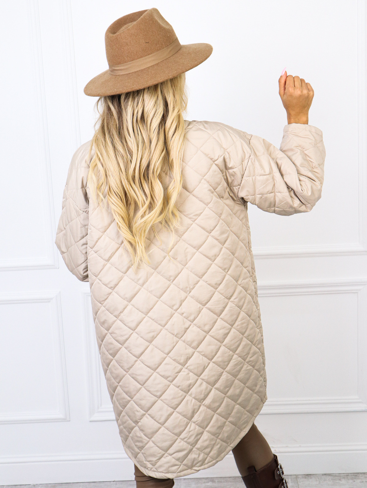 Długa, pikowana kurtka z panterkowym obszyciem od wewnątrz. Model z obniżoną linią ramion posiada ozdobną broszkę w kształcie róży.