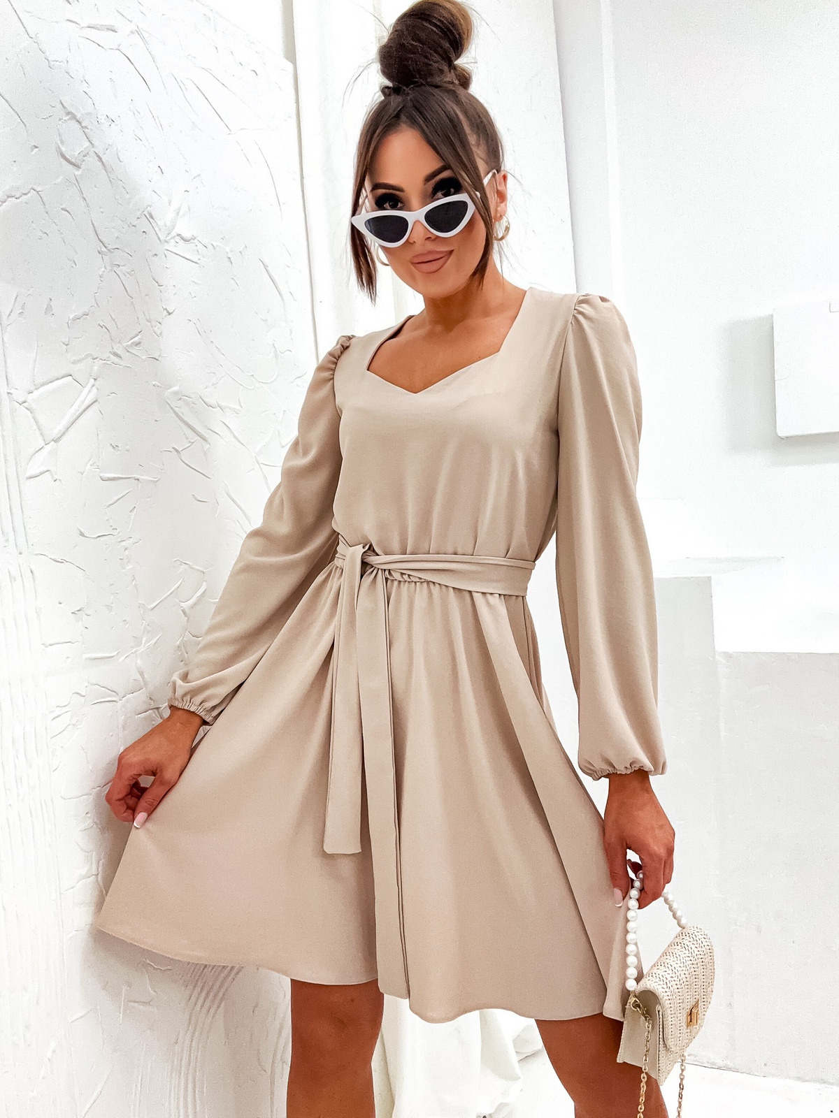 ELEGANCKA ROZKLOSZOWANA SUKIENKA Z PASKIEM- BEŻOWA