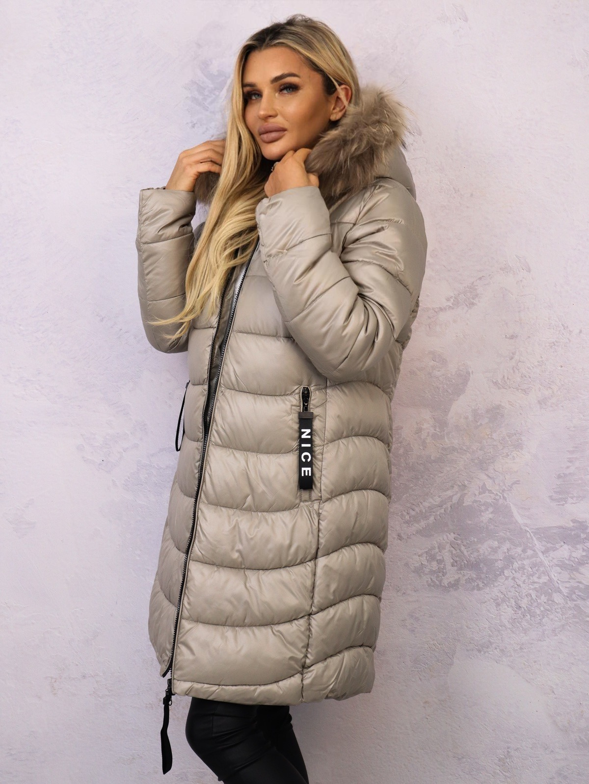 Długa, pikowana kurtka z kapturem. Ozdobne taśmy z napisem przy zamkach. Ściągacze przy rękawach, odpinane futro przy kapturze.
