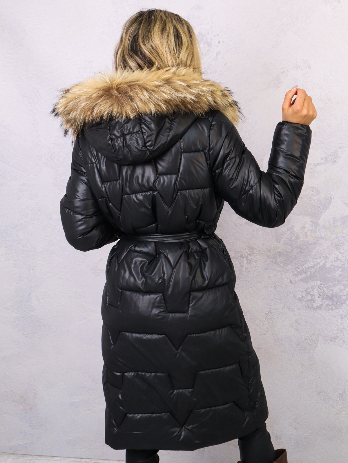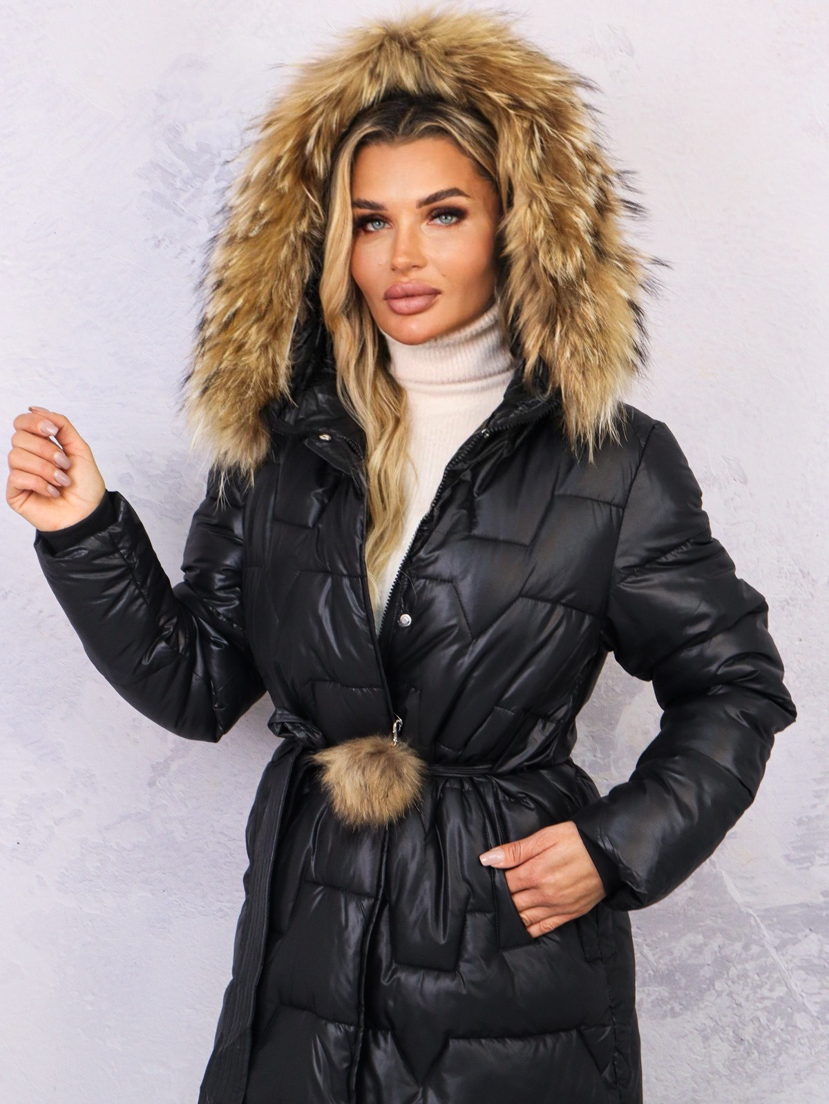 Długa, pikowana kurtka. Zapinana na zamek i zatrzaski. Futerko odpinane.