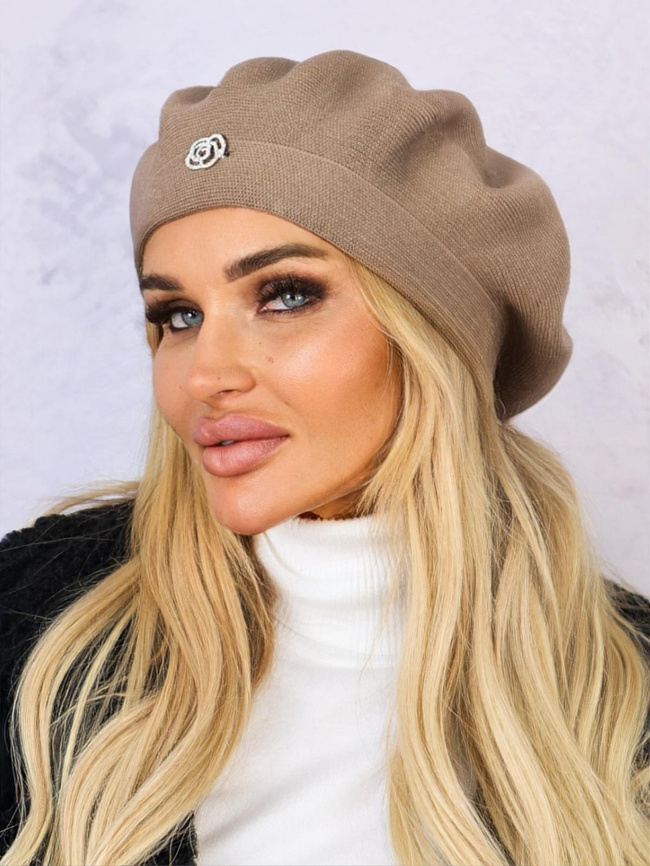 BERET DAMSKI Z BROSZKĄ- BRĄZOWY