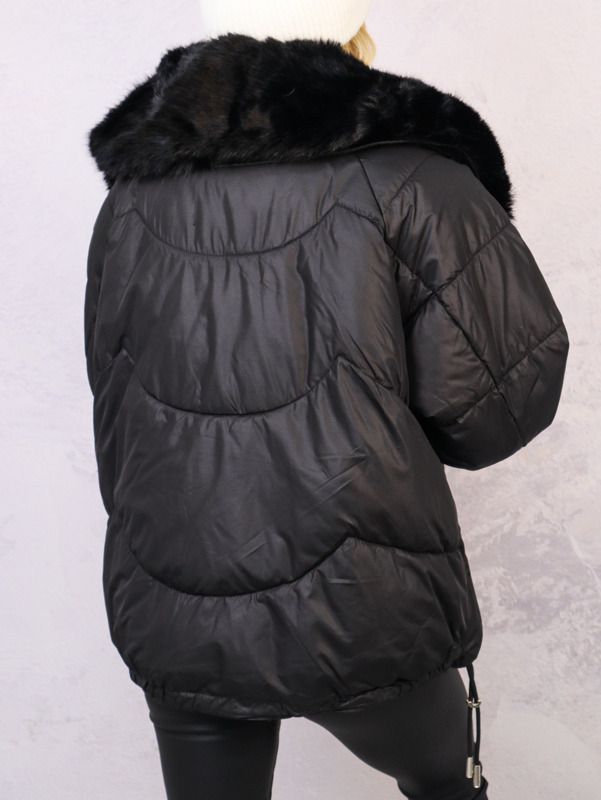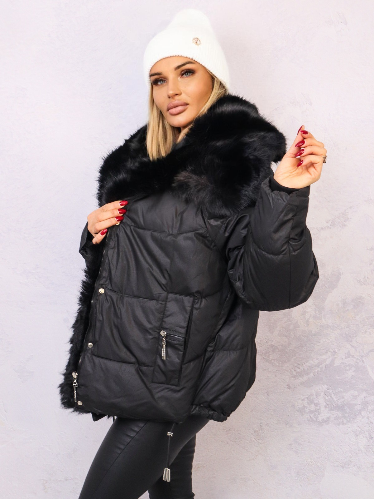 Kurtka pikowana, odpinane futerko, troczki na dole po bokach, ściągacze w rękawach.