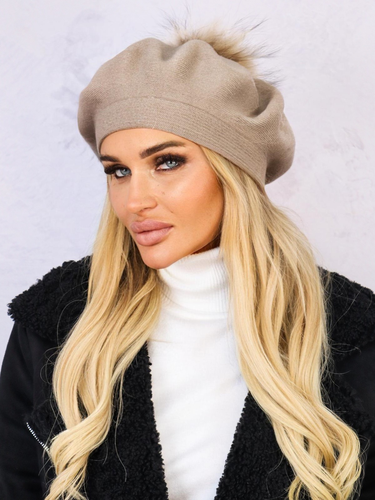 Klasyczny damski beret dzianinowy z pomponem z ekologicznego futerka. Elastyczna, doskonale dopasowuje się do głowy. Modna i ciepła, idealna na zimę, zapewnia komfort i elegancję.