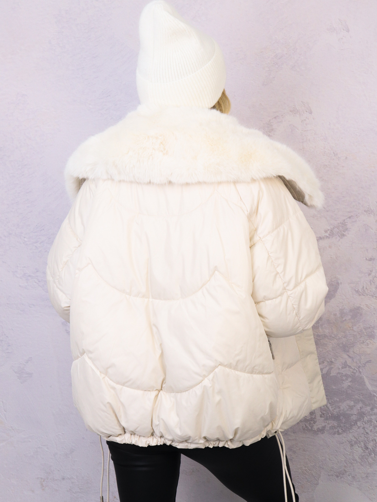 Kurtka pikowana, odpinane futerko, troczki na dole po bokach, ściągacze w rękawach.