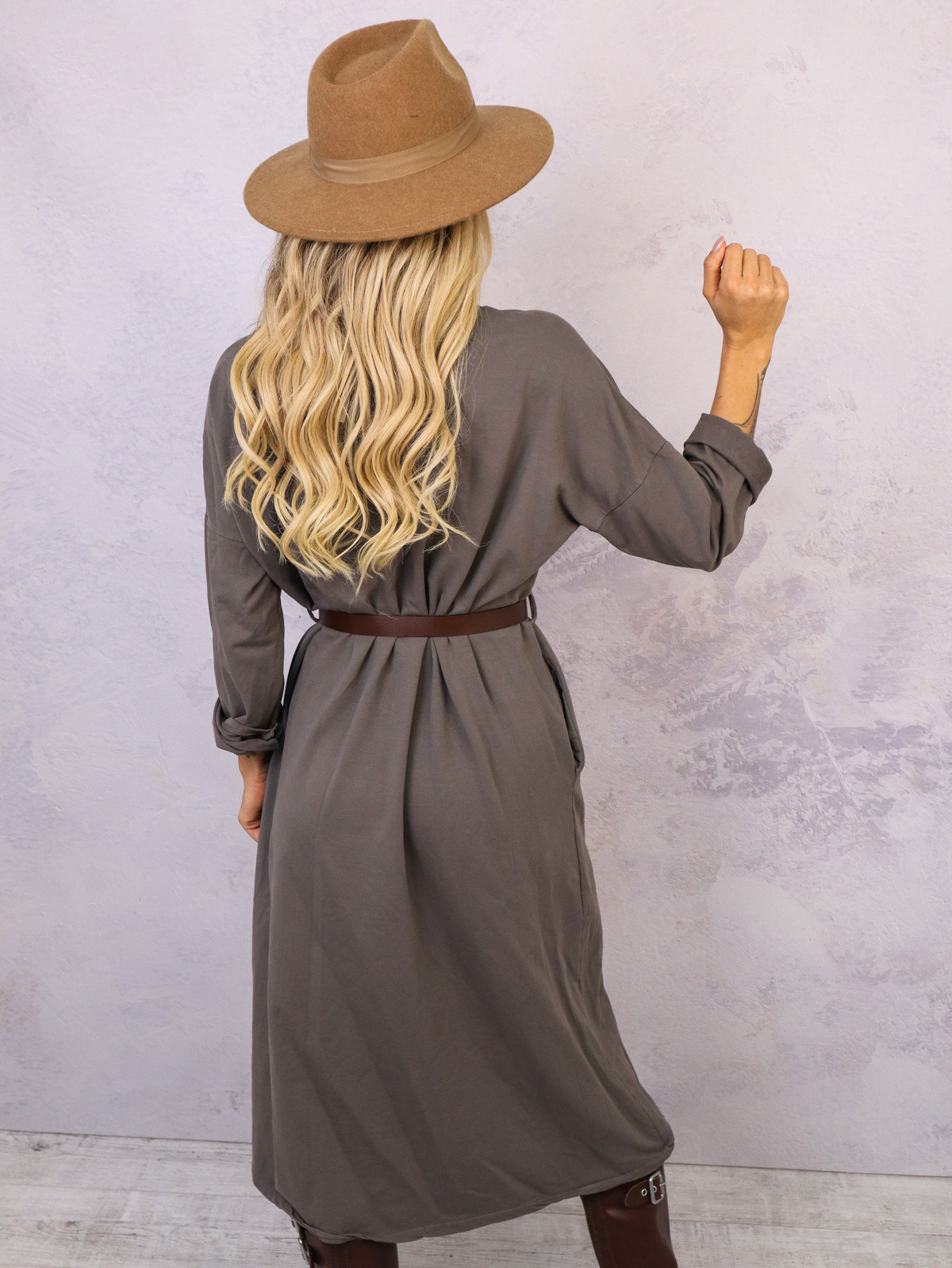 SUKIENKA MIDI Z DEKOLTEM W SEREK+ PASEK- CIEMNO SZARY