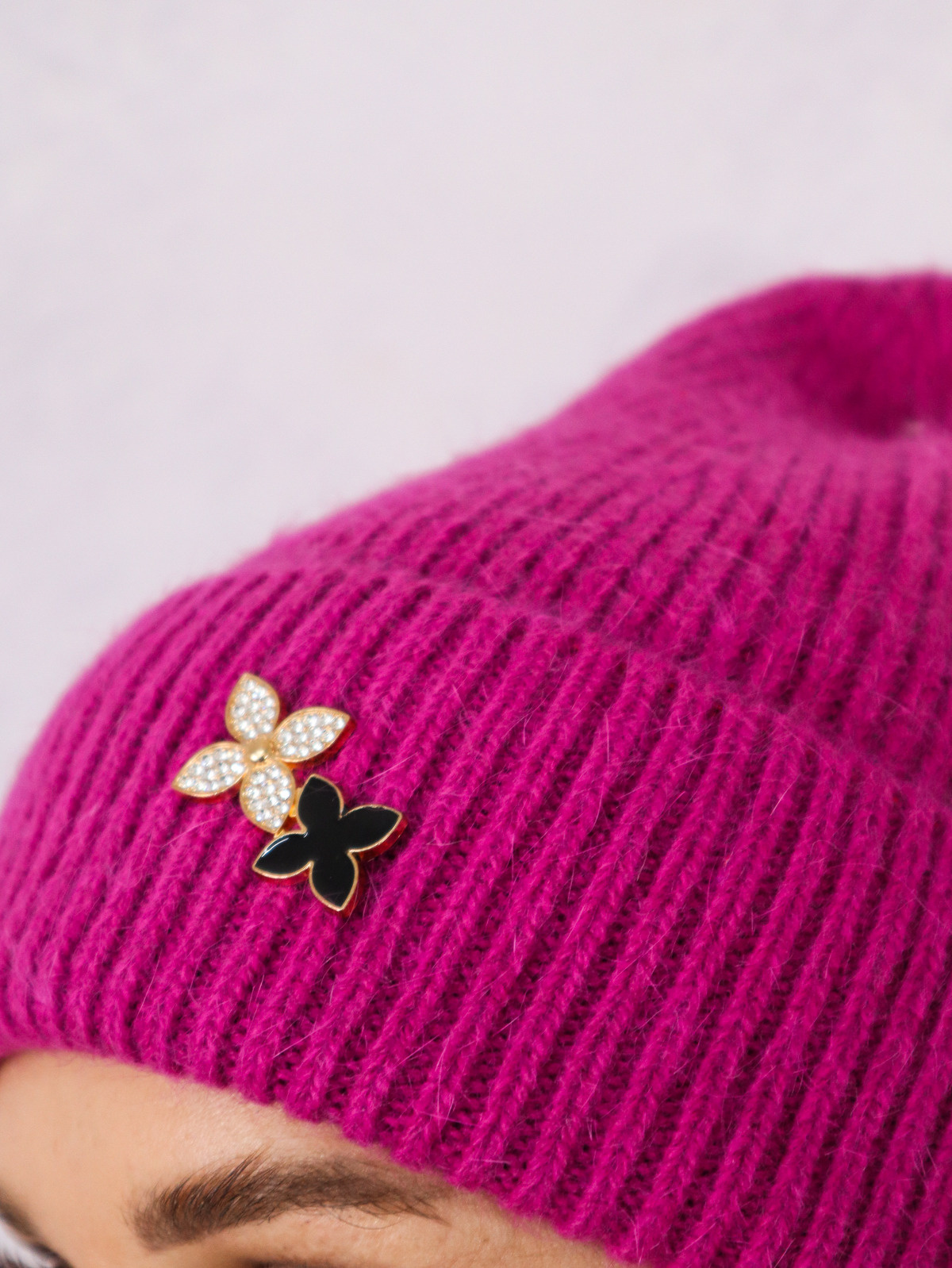 ZIMOWA CZAPKA Z BROSZKĄ W KWIATY- CIEMNY RÓŻ