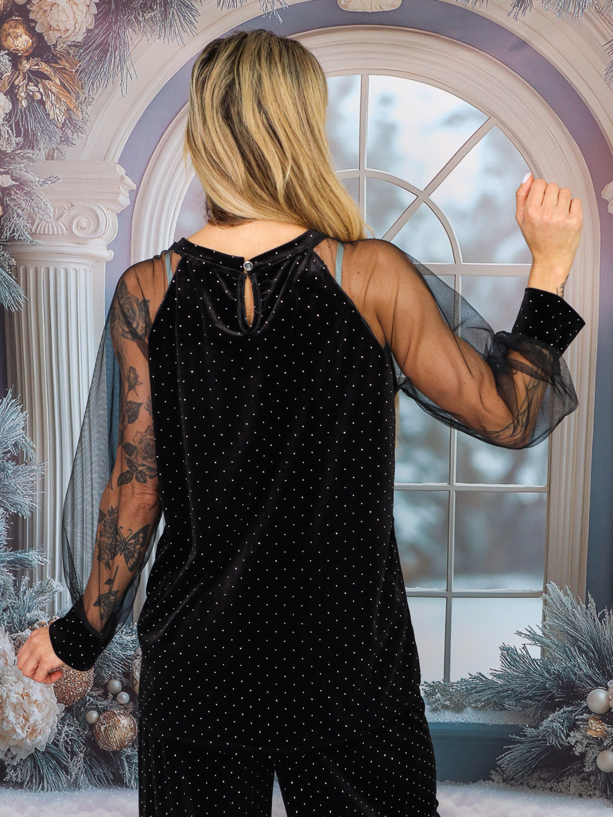WELUROWA BLUZKA ZDOBIONA CEKINAMI Z TIULOWYMI RĘKAWAMI- CZARNA