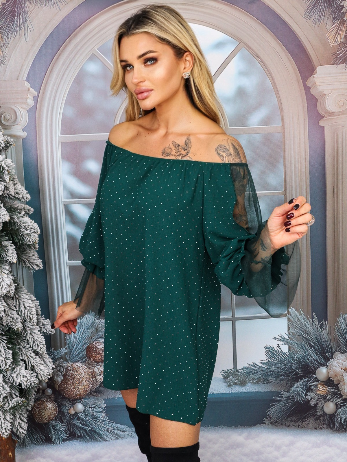 BLUZKA W CYRKONIE Z OZDOBNYM RĘKAWEM Z SIATKI I I FALBANKĄ- ZIELONA