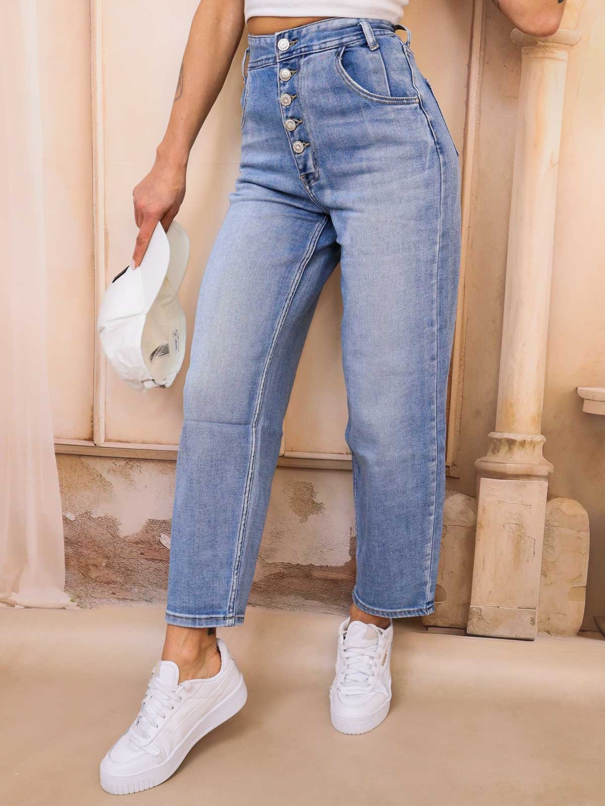 Spodnie jeansowe z asymetrycznym pasem. Zapinane na guziki. Szerokie nogawki.