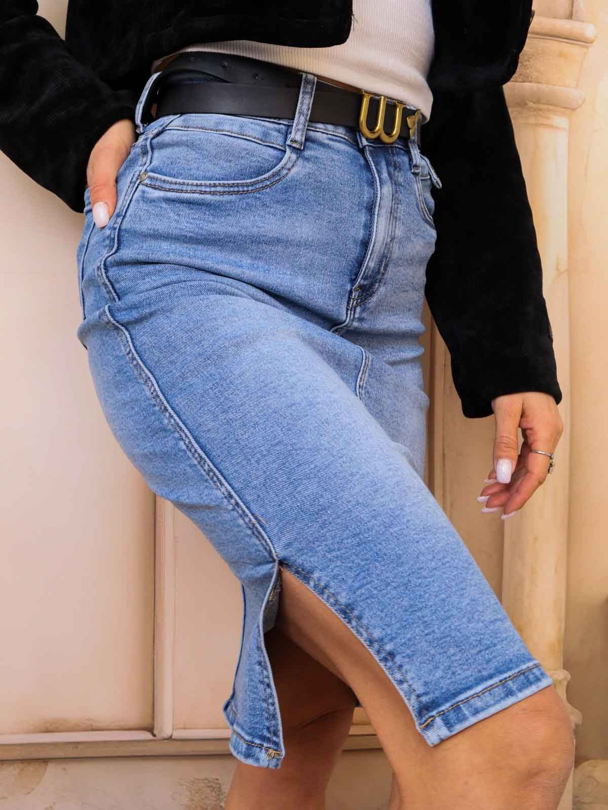 SPÓDNICA JEANSOWA MIDI Z ROZPORKIEM NA BOKU+ PASEK