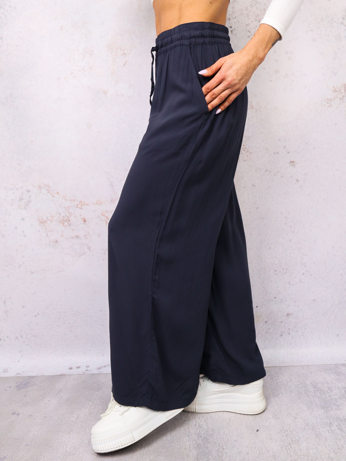 SPODNIE MATERIAŁOWE Z SZEROKIMI NOGAWKAMI- GRANATOWE