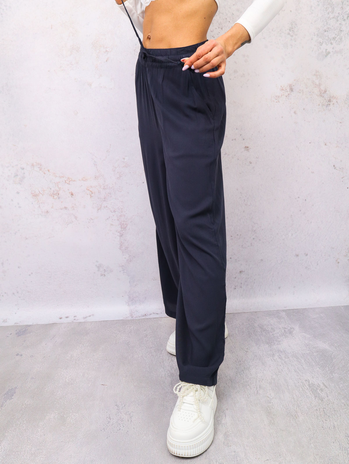 Spodnie materiałowe z szerokimi nogawkami, wiązane w pasie.