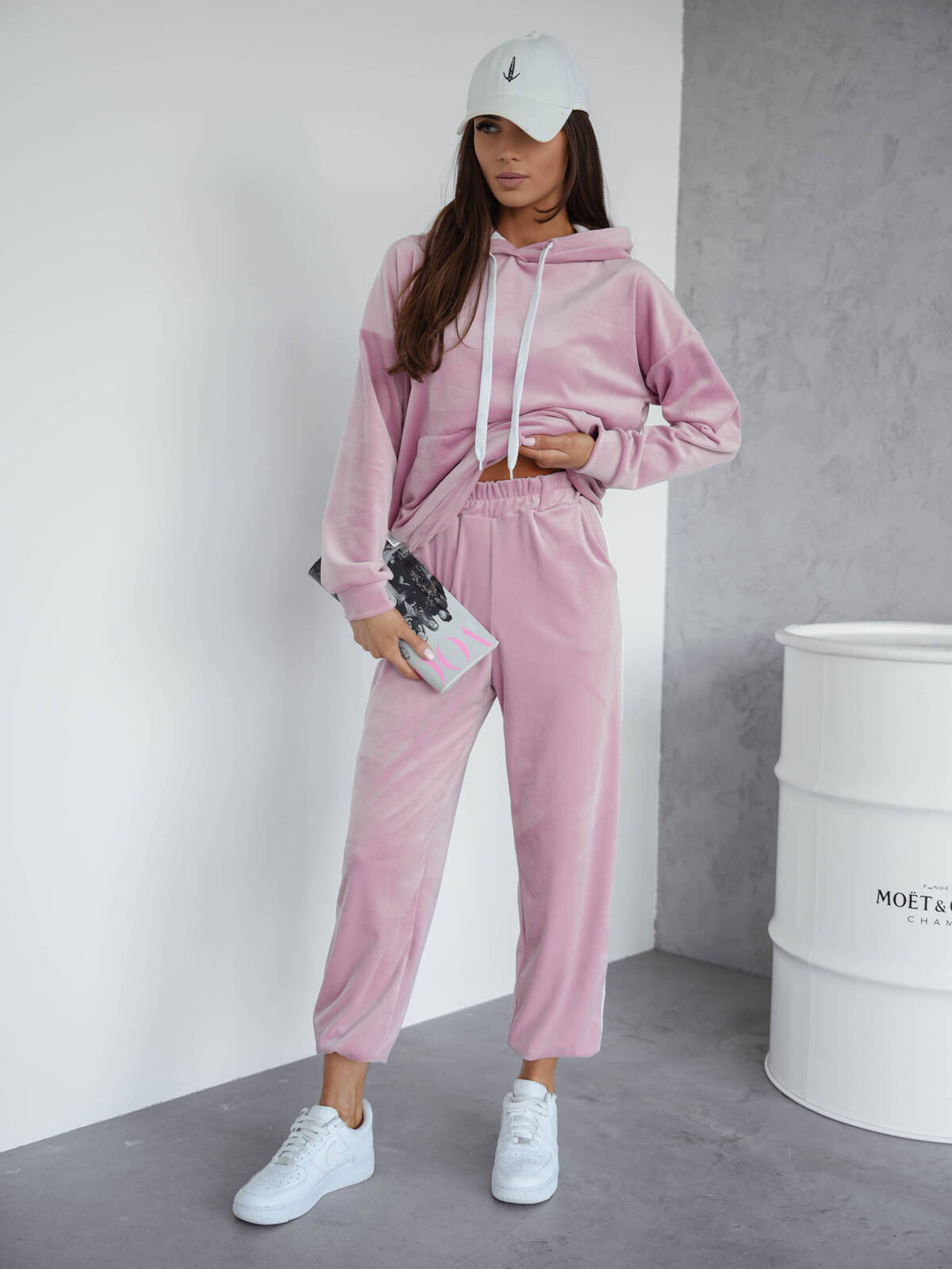 Komplet dresowy, welurowy, dwuczęściowy. Bluza z kontrastowym kapturem i sznurkami. Z przodu kieszeń kangurka. Rękawy i bluza zakończone ściągaczem. Spodnie z gumą w pasie zakończone ściągaczem. Posiadają kontrastowe lampasy po bokach.