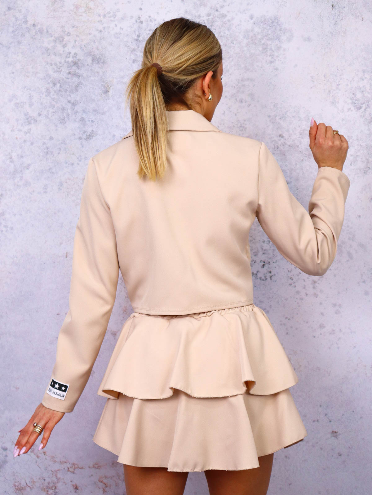 KOMPLET KRÓTKA MARYNARKA+ SPÓDNICO-SPODENKI Z FALBANAMI- BEŻOWY