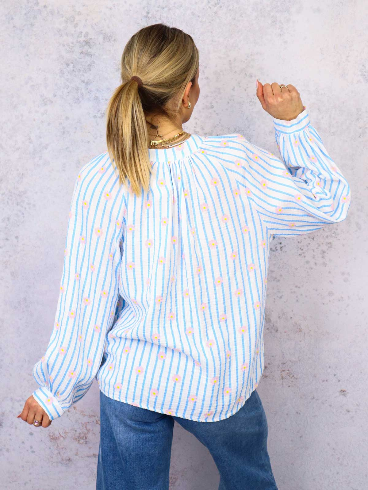 BLUZKA KOSZULOWA W PASKI I KWIATKI- NIEBIESKA
