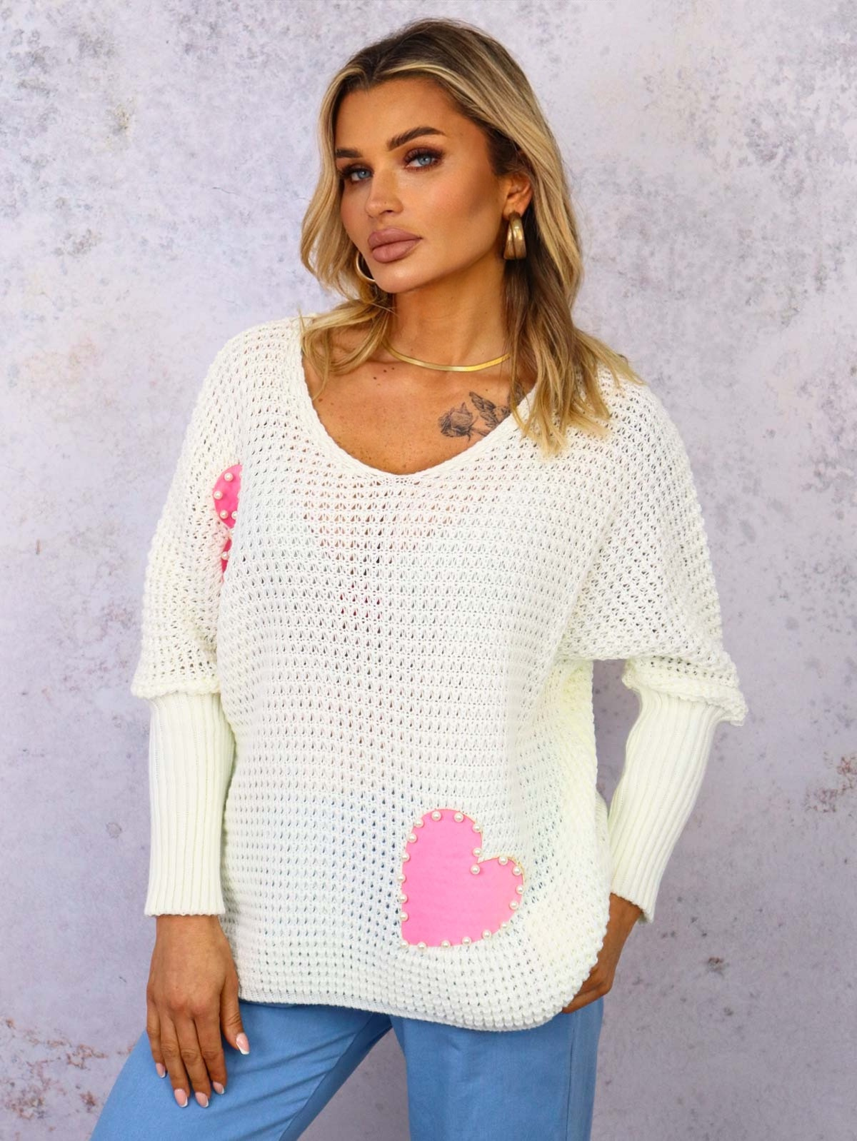 SWETER Z SERDUSZKAMI OVERSIZE- BIAŁY
