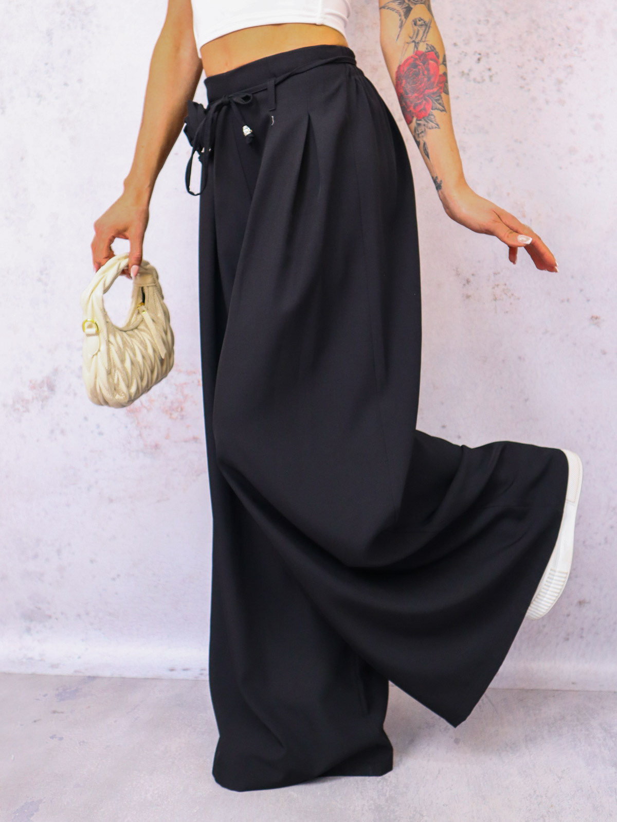 SPODNIE MATERIAŁOWE Z SZEROKIMI NOGAWKAMI I WIĄZANIEM W PASIE- CZARNE