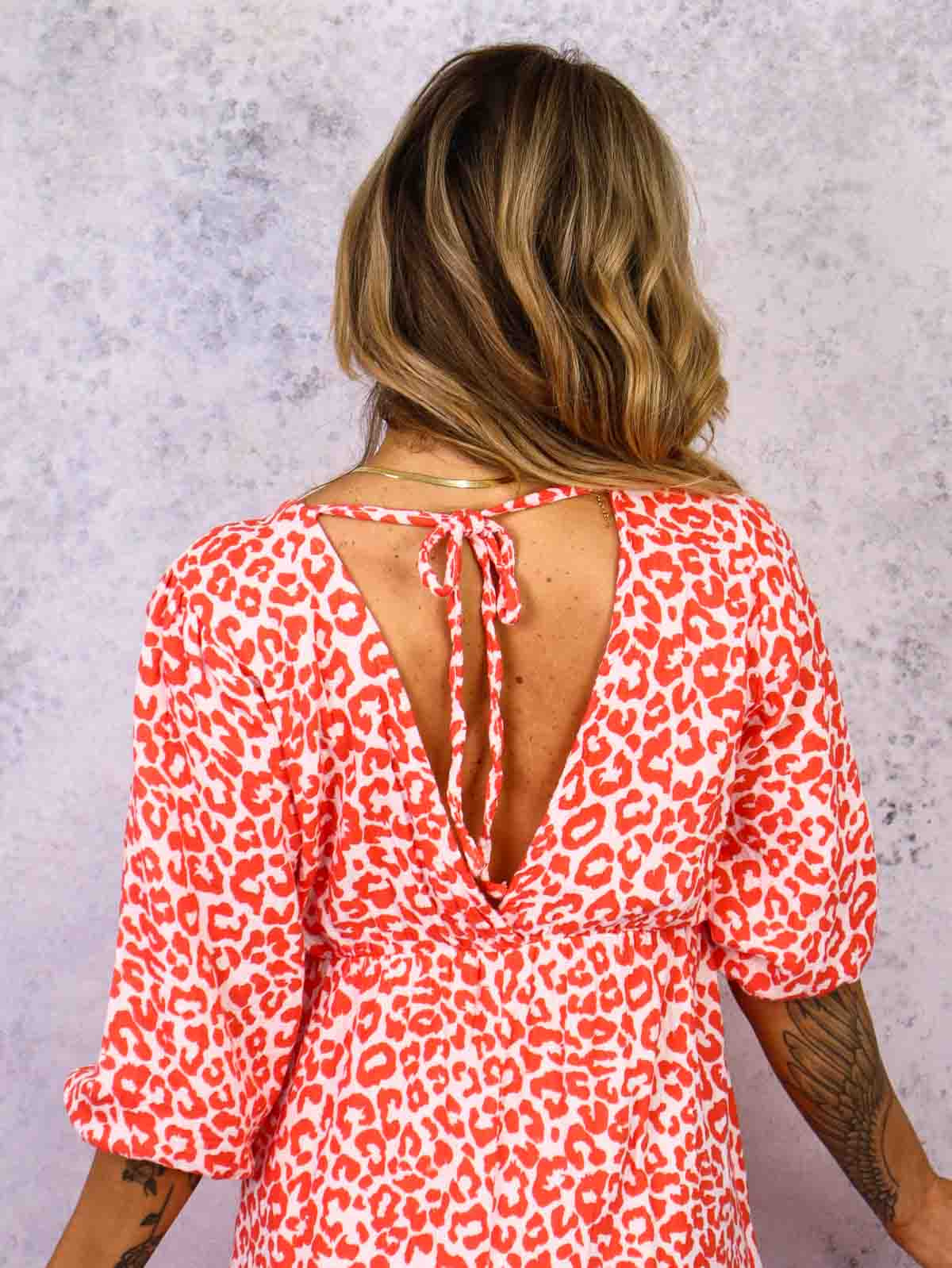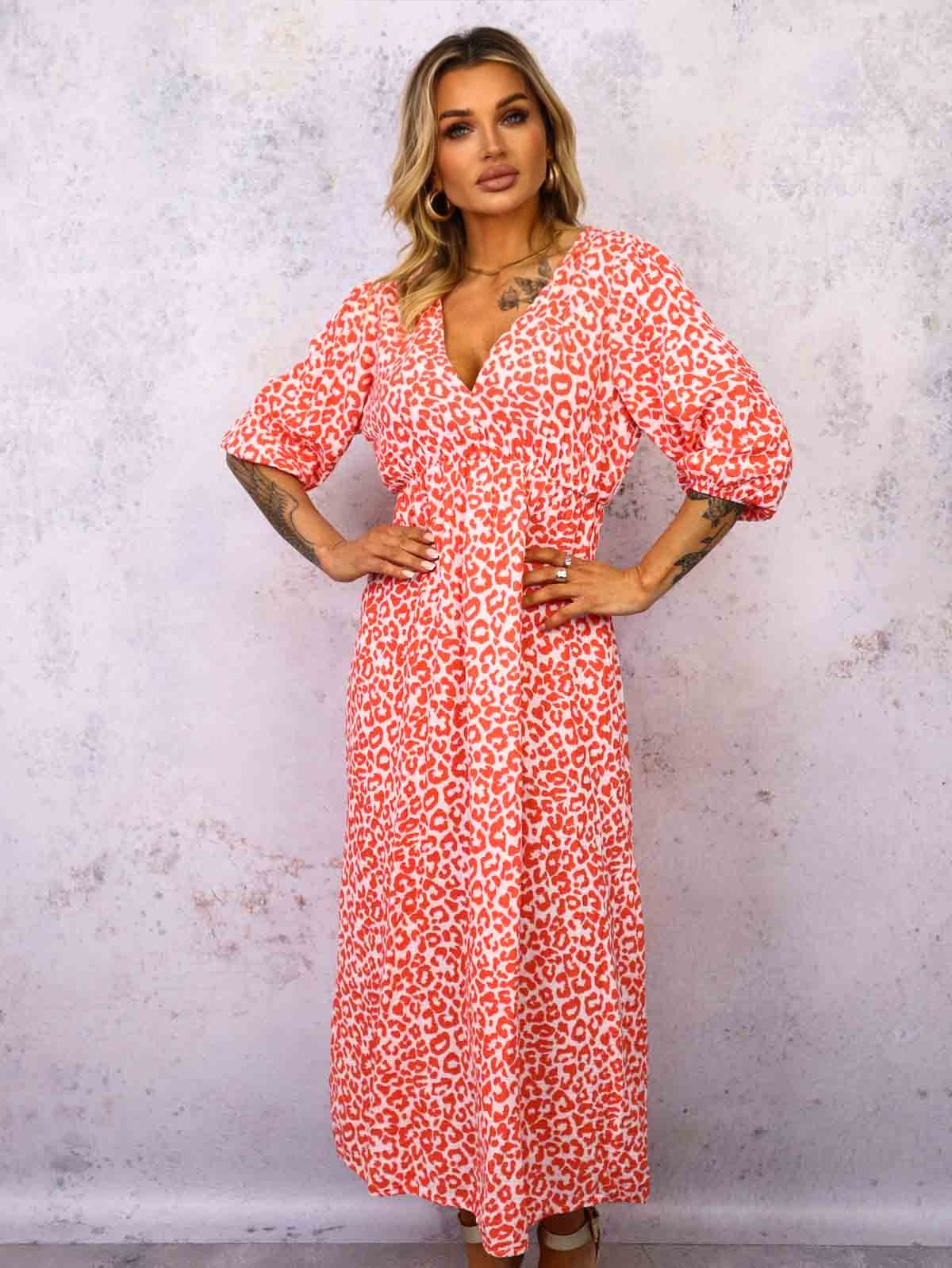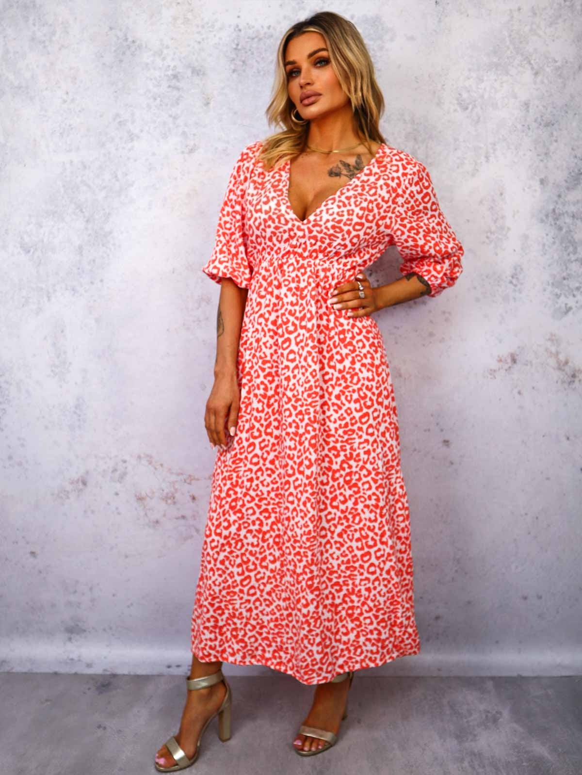 Sukienka maxi w cętki. Model z wiązaniem na plecach, rękawy zakończone gumką. W pasie wszyta guma dzięki której sukienka idealnie dopasuje się do sylwetki.