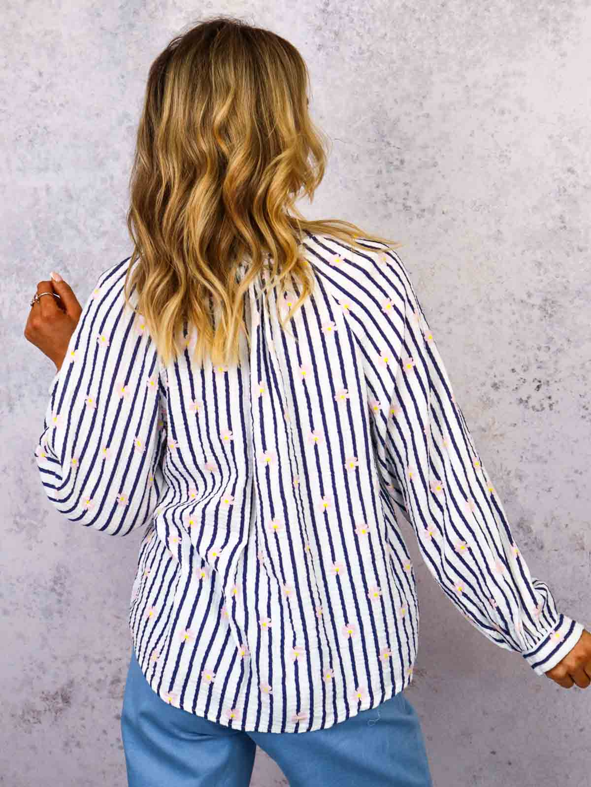 BLUZKA KOSZULOWA W PASKI I KWIATKI- GRANATOWA
