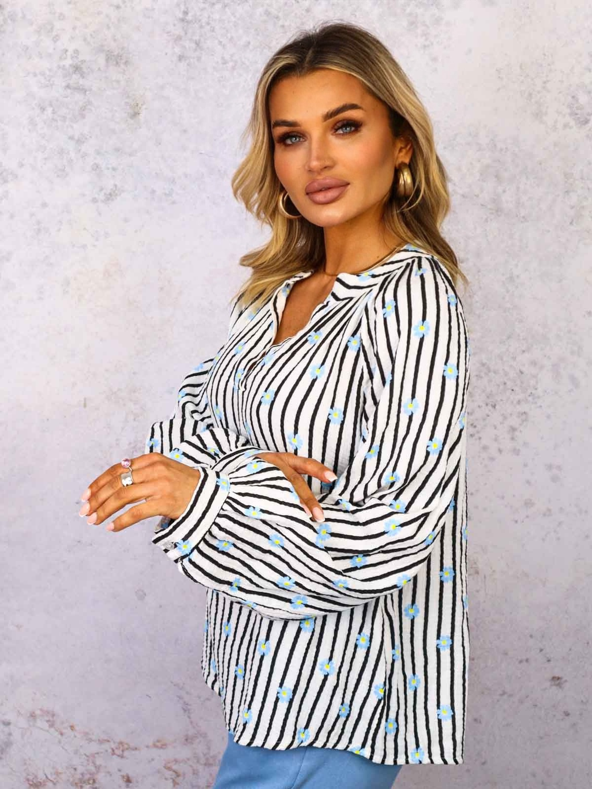 BLUZKA KOSZULOWA W PASKI I KWIATKI- CZARNA